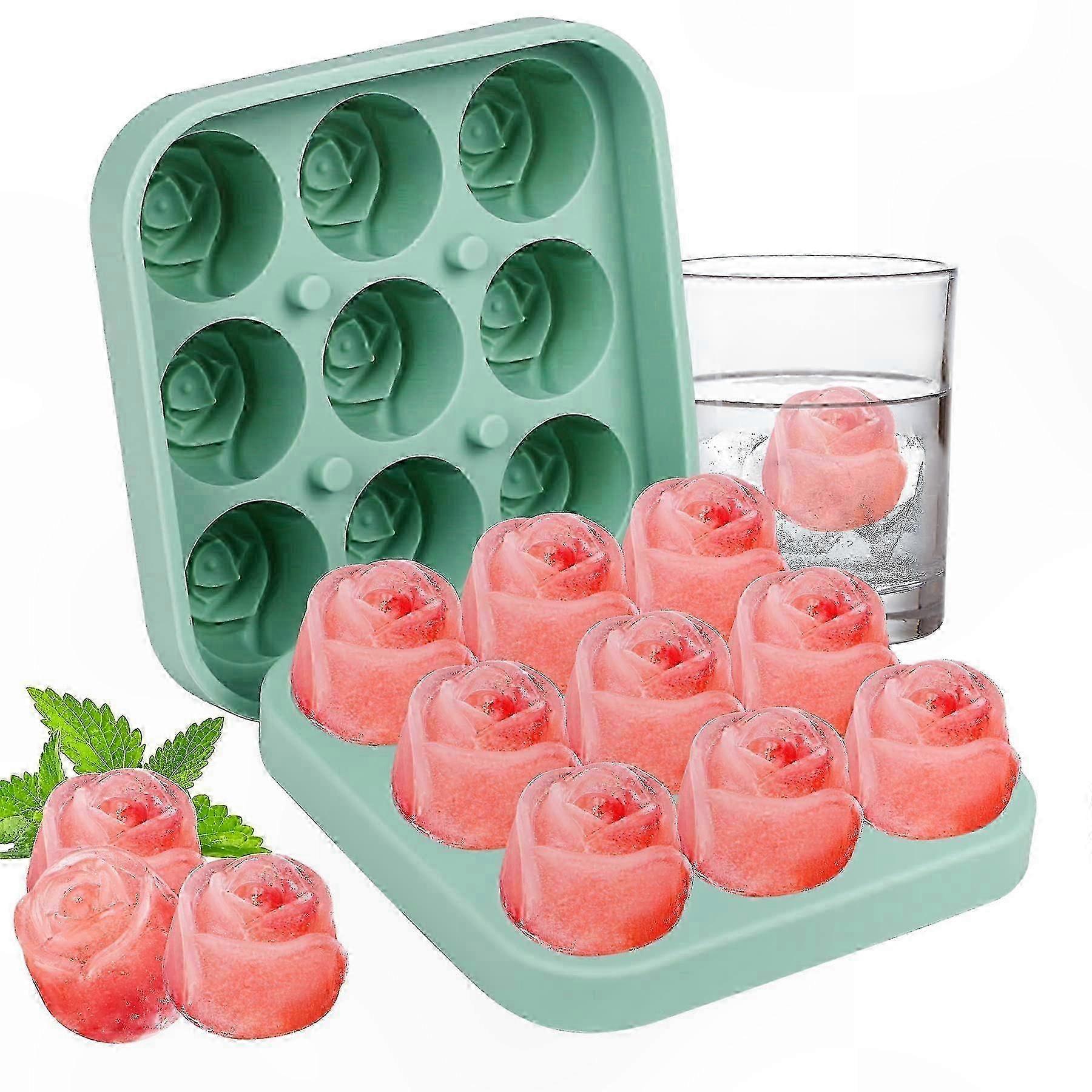 9-Cavity Rosette Ice Cube Mold with Lid, Green Silicone Ice Tray for Perfect Cubes
