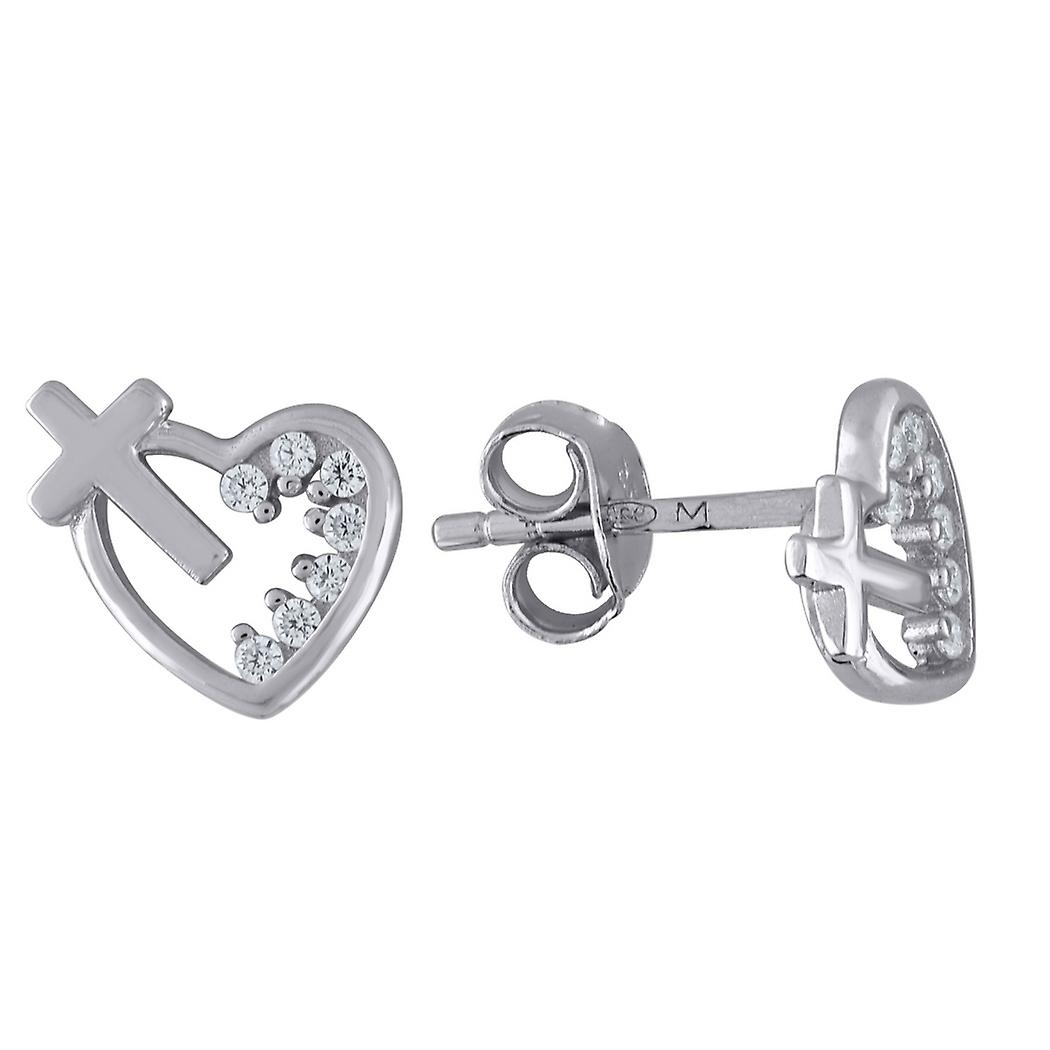 925 Sterling Silver Cubic Zirconia Love Heart Religious Faith Cross 1.19gm Womens Stud Earrings 8.2x9.8mm Wide-Stud Earr