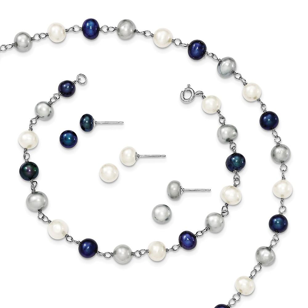 Sterling Silver Freshwater Cultured Pearl 18 In Neck. 7.25 In Bracelet and 3 Piece Ea - in Sterling Silver - Product Attributes: - Post Earrings - Spring Ring - - Length of Item: 18 in - Chain Length: 18 & 7.25 in - Chain Width: 6 to 8 mm (range) - Clasp /Connector: Spring Ring - Earring Closure: Post & Push Back - Earring Type: Ball - Finish: Polished - Chain Type: Pearl - Feature: Solid - - [ Potential Enhancement Methods: Cultured Pearl ] - Usually bleached and polished to achieve uniform color and shape. May be dyed or irradiated to produce various colors. - [ Care and Handling: Cultured Pearl ] - Do not use ultrasonic cleaner or steamer. Avoid contact with cosmetics, hair spray, perfume and household chemicals. Clean with a soft cloth. -