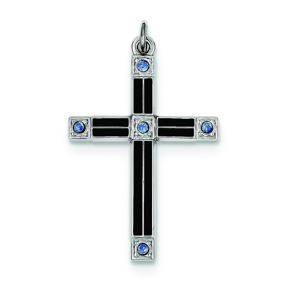 925 Sterling Silver Solid Polished Black Enameled Religious Faith Cross Pendant Necklace With Blue Cubic Zirconia 31x20m