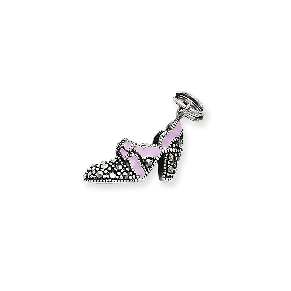 Sterling Silver Lavendar Enamel and Marcasite Shoe Charm - Measures 26x15mm Wide 7.2mm Thick - in Sterling Silver - - Product Attributes: - Solid - - Charm/Element Width: 15 mm - Charm/Element Thickness: 7.2 mm - Width of Item: 15 mm - Charm/Element Length: 26 mm - Length of Item: 26 mm - Finish: Polished & Antiqued - Feature: 3D - - This Item Does Not Ship With a Chain - - [ Care and Handling: marcasite ] - Avoid chemicals, steam and ultrasonic cleaning. -