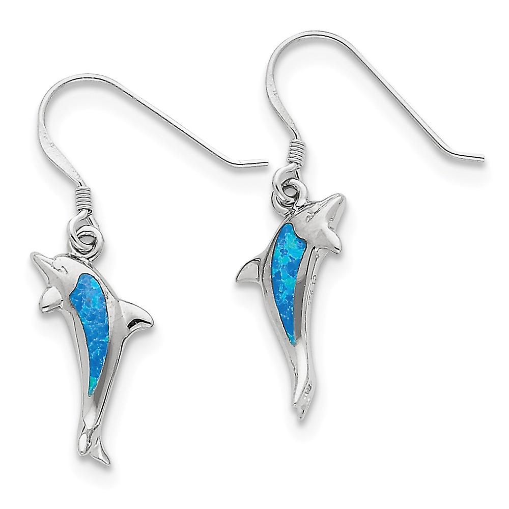 925 Sterling Silver Polished Shepherd hook Simulated Blue Simulated Opal Inlay Dolphin Long Drop Dangle Earrings 35x11mm