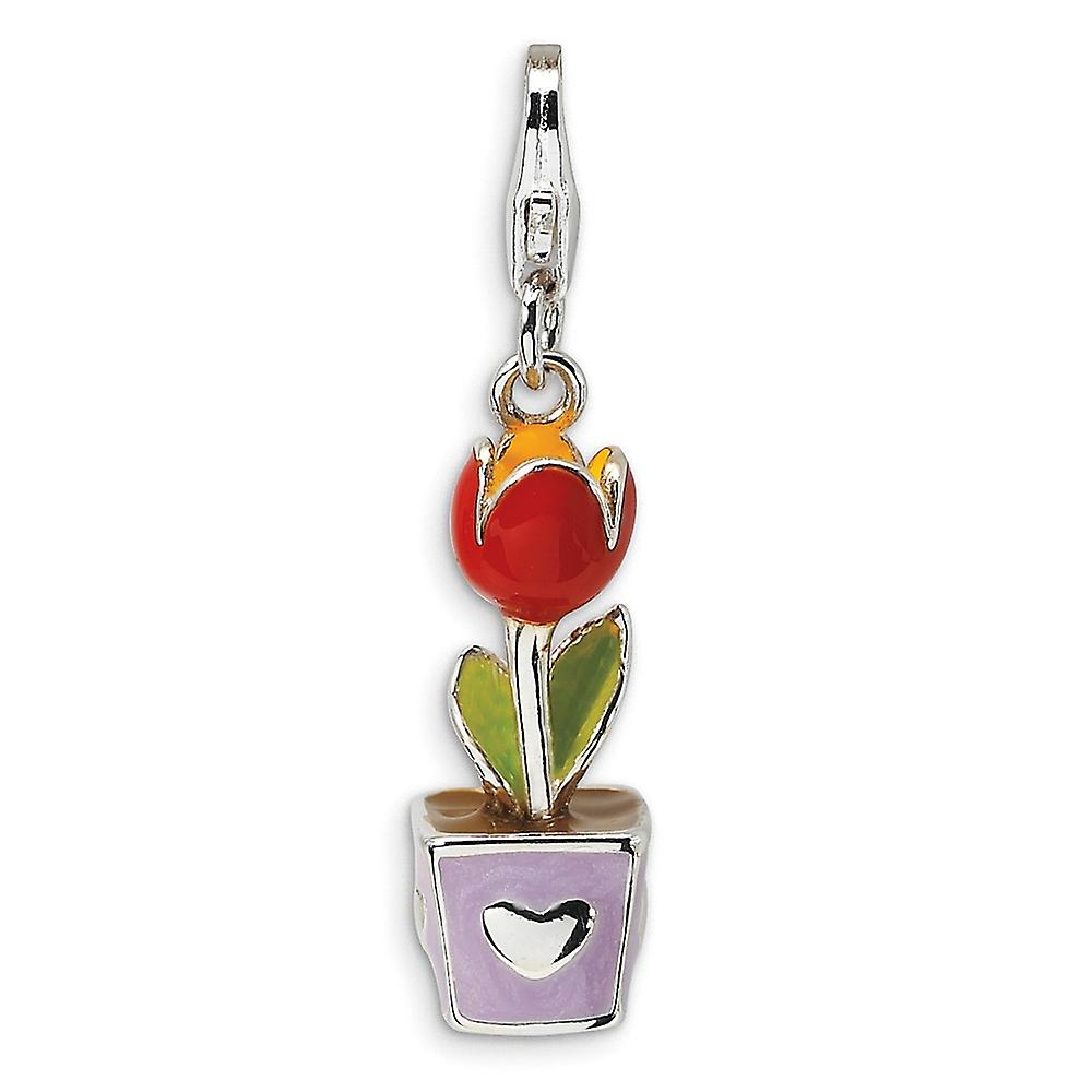 925 Sterling Silver Polished Fancy Lobster Closure 3 D Red Enamel Potted Tulip Flower With-Lobster Clasp Charm 31x7mm Pe