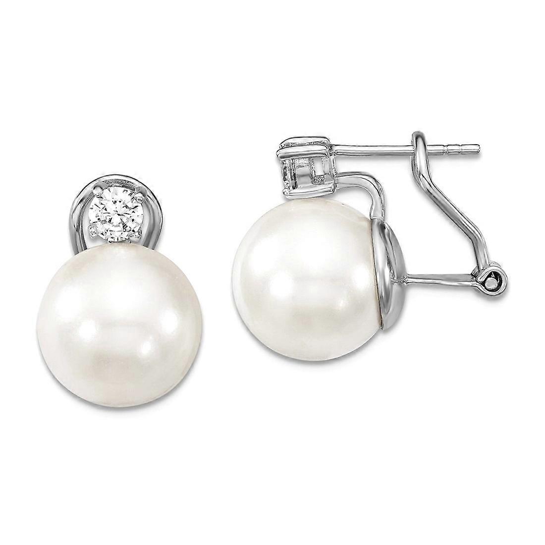 925 Sterling Silver Polished Majestik Rhodium Plated12 13mm White Imitat Shell Pearl CZ Omega Back Earrings Stud Earring