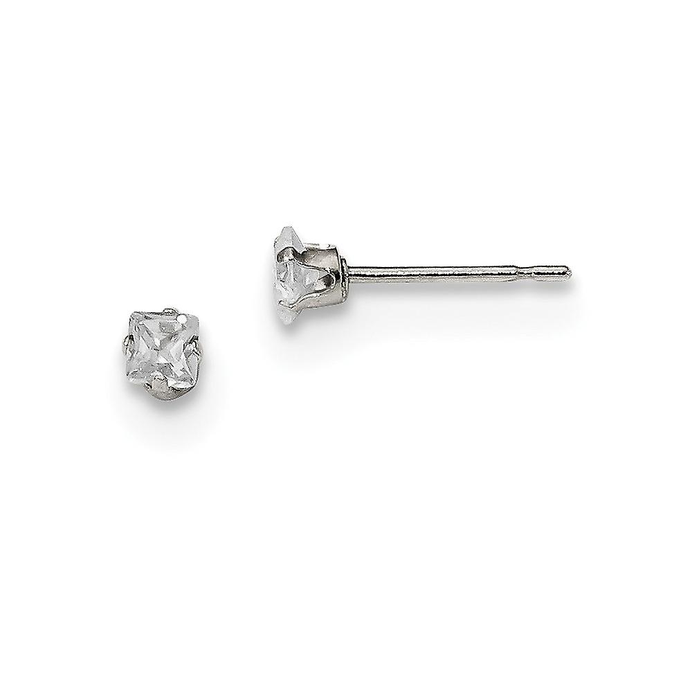 Sterling Silver 3mm Square Cubic Zirconia 4 Prong Stud Earrings - Measures 3x3mm Wide - in Sterling Silver - Product Attributes: - Post Earrings - Radiant Cut - Snap setting - - Width of Item: 3 mm - Length of Item: 3 mm - Earring Closure: Post & Push Back - Earring Type: Stud - Finish: Polished - Feature: Snap-in Mounting - - [ Potential Enhancement Methods: cubic zirconia ] - Synthetic. Some are covered with a product that makes the stone more durable. - [ Care and Handling: cubic zirconia ] - Clean with warm soapy water and a soft cloth. -
