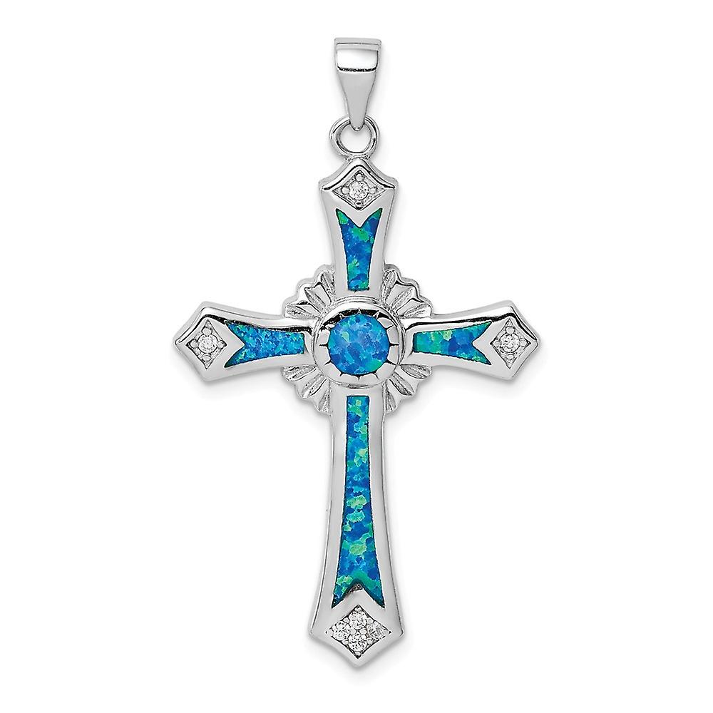 925 Sterling Silver Rhodium Plated Simulated Blue Opal and Cubic Zirconia Religious Faith Cross Pendant Necklace-Pendant