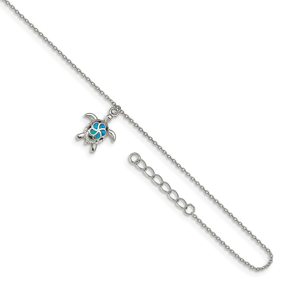 925 Sterling Silver Rhodium Plated Simulated Blue Opal Turtle With 1inch Ext. Anklet 9 Inch 12.9mm Wide-Anklet for Women