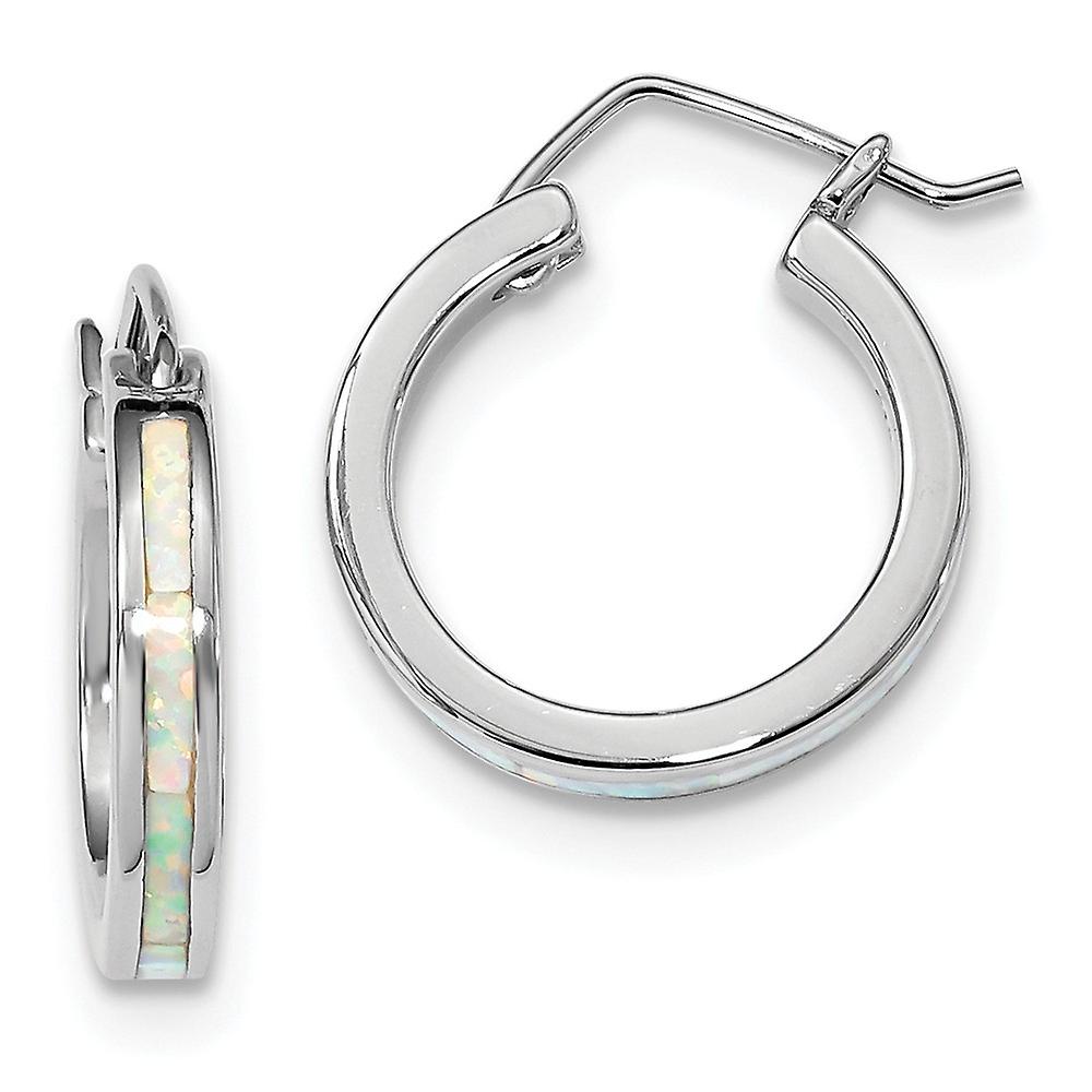Sterling Silver Rhodium-plated White Simulated Opal Hoop Earrings - Measures 21.6x3.3mm Wide 2.3mm T - in Sterling Silver - - Thickness: 3.5 mm - Width of Item: 20 mm - Length of Item: 21.6 mm - Earring Closure: Wire & Clutch - Earring Type: Hoop - Finish: Polished - Feature: Solid - - [ Potential Enhancement Methods: opal ] - Occasionally treated to enhance the color. Sometimes infused with wax, oil or plastic to enhance appearance and durability. - [ Care and Handling: opal ] - Do not use ultrasonic cleaner or steamer. Avoid heat and contact with cosmetics, hair spray, perfume and household chemicals. Clean with a damp cloth or soft brush. -