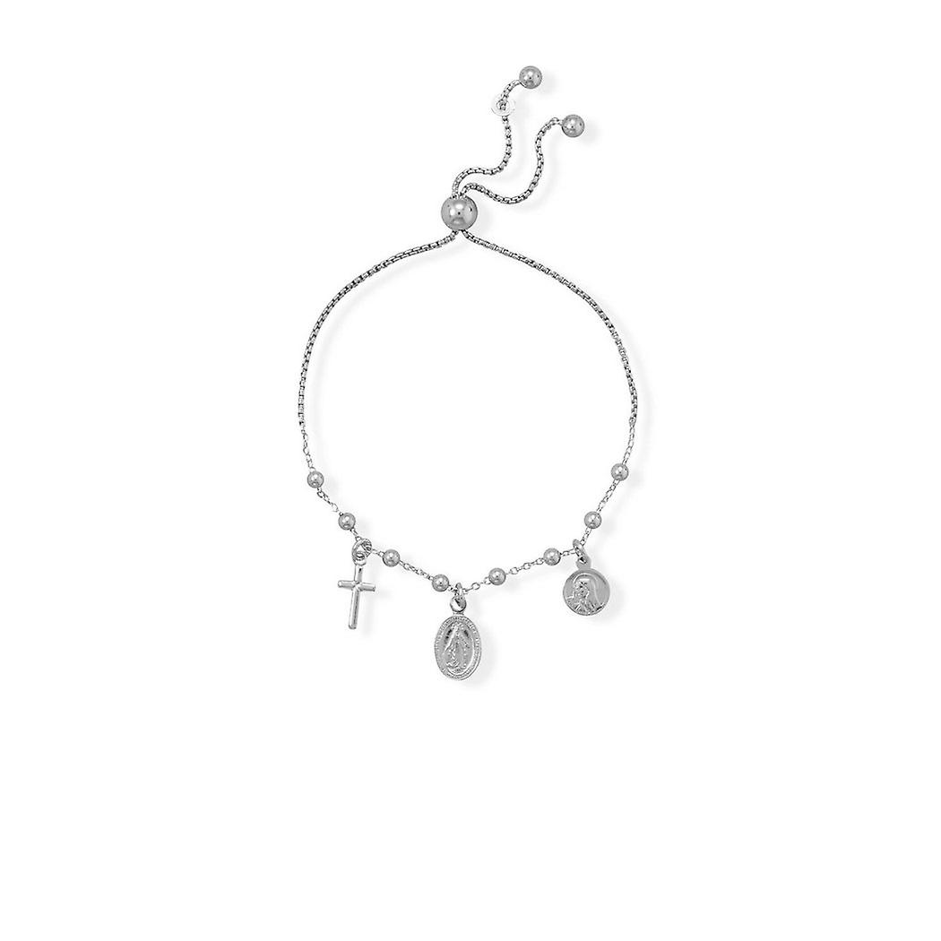 Sterling Silver Rhodium Plated Religious Charm Bolo Bracelet Feautures Three Charms: Cross - In Sterling Silver in Plated Metal - - This Item Does Not Ship With a Chain