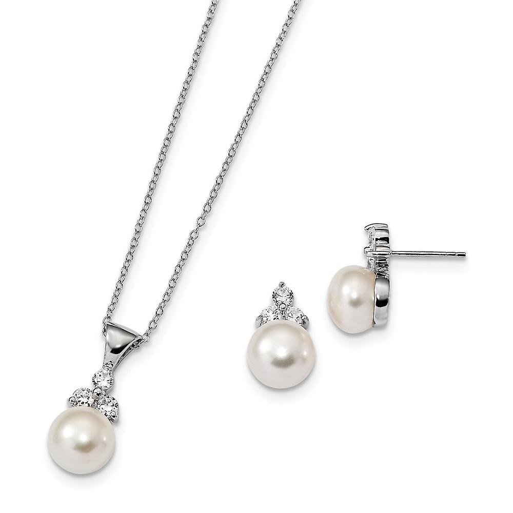 Sterling Silver Rh 9-10mm Coin Freshwater Cultured Pearl Cubic Zirconia Earrings Necklace Set - in Sterling Silver - - Chain Length: 17 in - Chain Width: 0.6 mm - Clasp /Connector: Spring Ring - Earring Closure: Post & Push Back - Earring Type: Button - Finish: Polished - Feature: Solid - Clasp Width (Male end): 5.3 mm - Clasp Width (Female end): 3 mm - - [ Potential Enhancement Methods: cubic zirconia ] - Synthetic. Some are covered with a product that makes the stone more durable. - [ Care and Handling: cubic zirconia ] - Clean with warm soapy water and a soft cloth. - - [ Potential Enhancement Methods: Cultured Pearl ] - Usually bleached and polished to achieve uniform color and shape. May be dyed or irradiated to produce various colors. - [ Care and Handling: Cultured Pearl ] - Do not use ultrasonic cleaner or steamer. Avoid contact with cosmetics, hair spray, perfume and household chemicals. Clean with a soft cloth. -