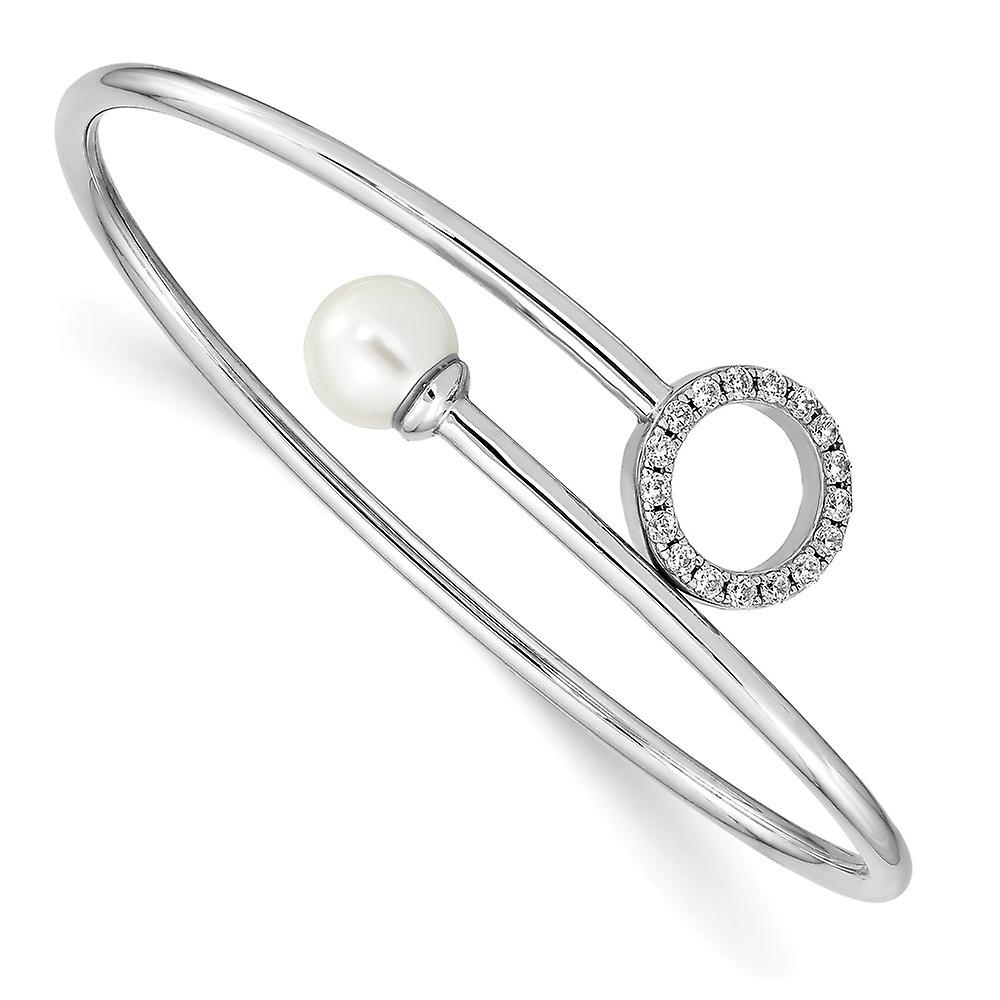 925 Sterling Silver Rh pl Simulated Shell Pearl and Wht Cubic Zirconia Flexible Bangle Bracelet Cuff-Bracelet for Women