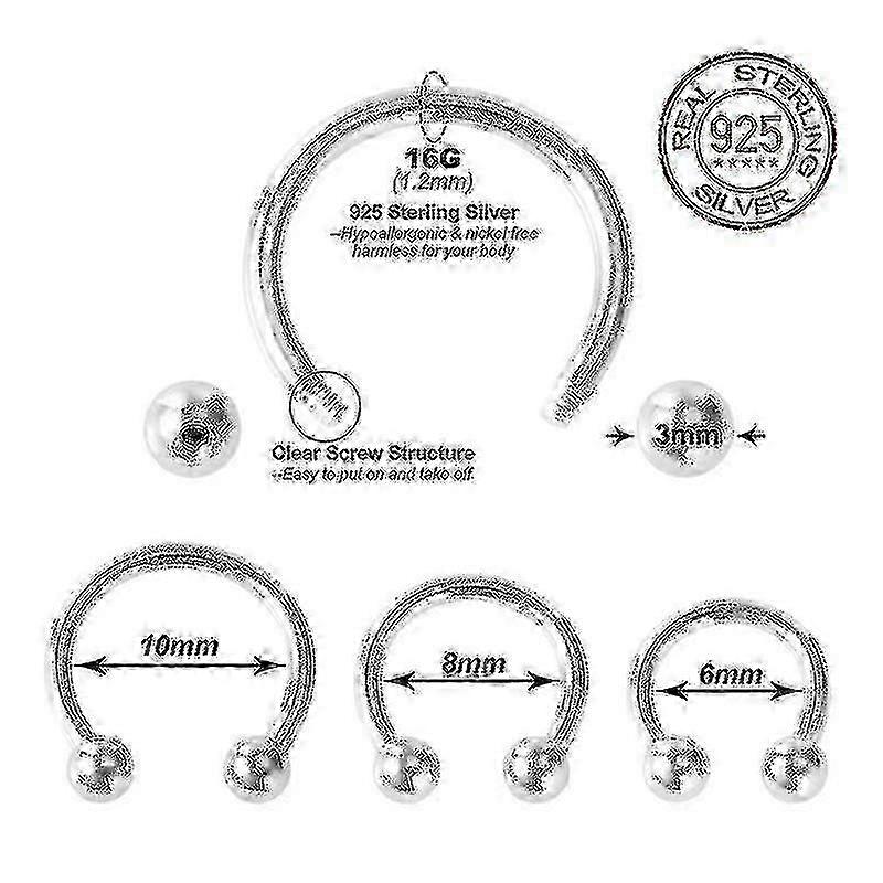 925 Sterling Silver Nose Septum Rings Horseshoe Piercing Jewelry 16g Cartilage Helix Tragus Earring Lip Piercing 6mm 8mm 10mm