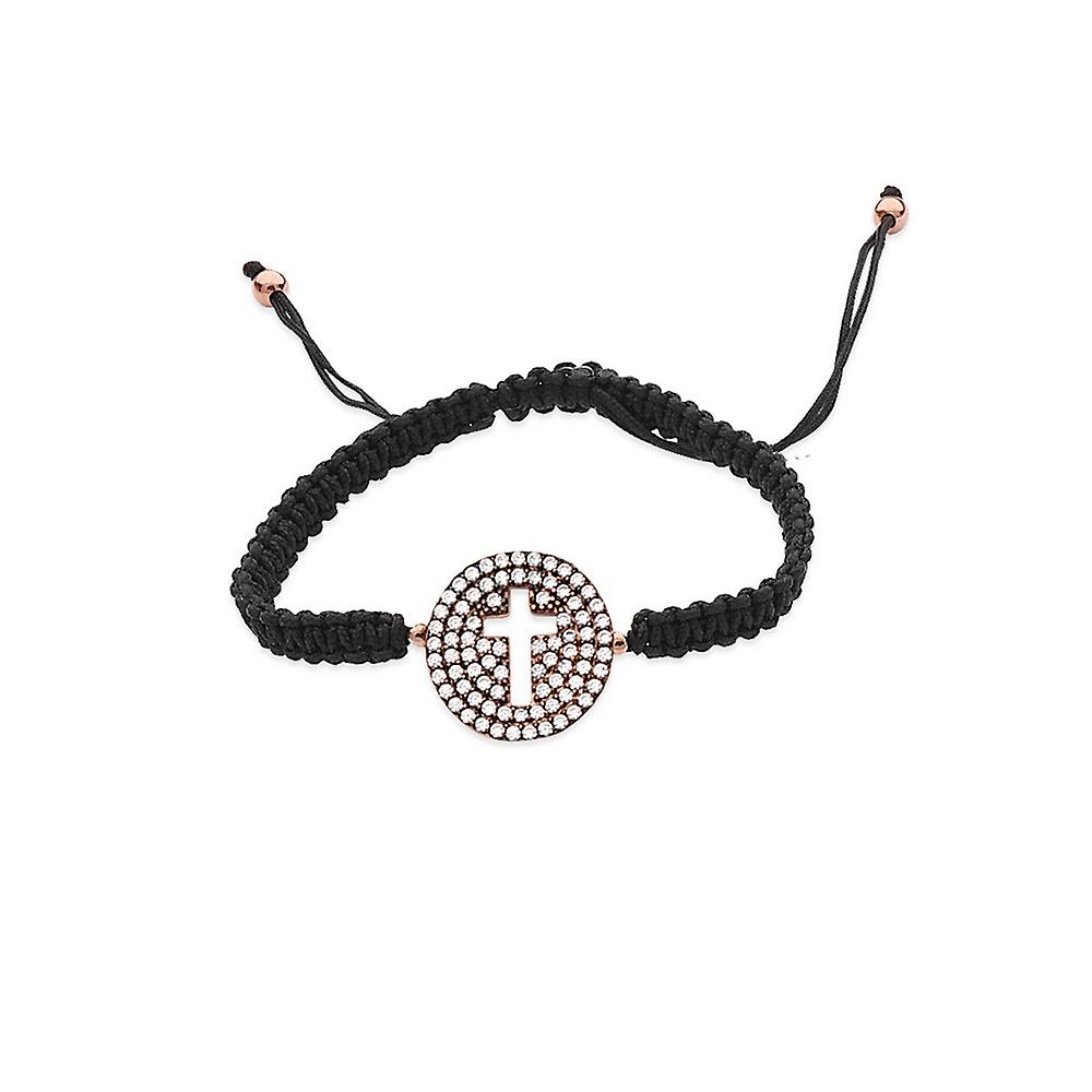 925 Sterling Silver Rose and Black Medium Cubic Zirconia Disk With Cut Out Religious Faith Cross Element Bracelet Link-B