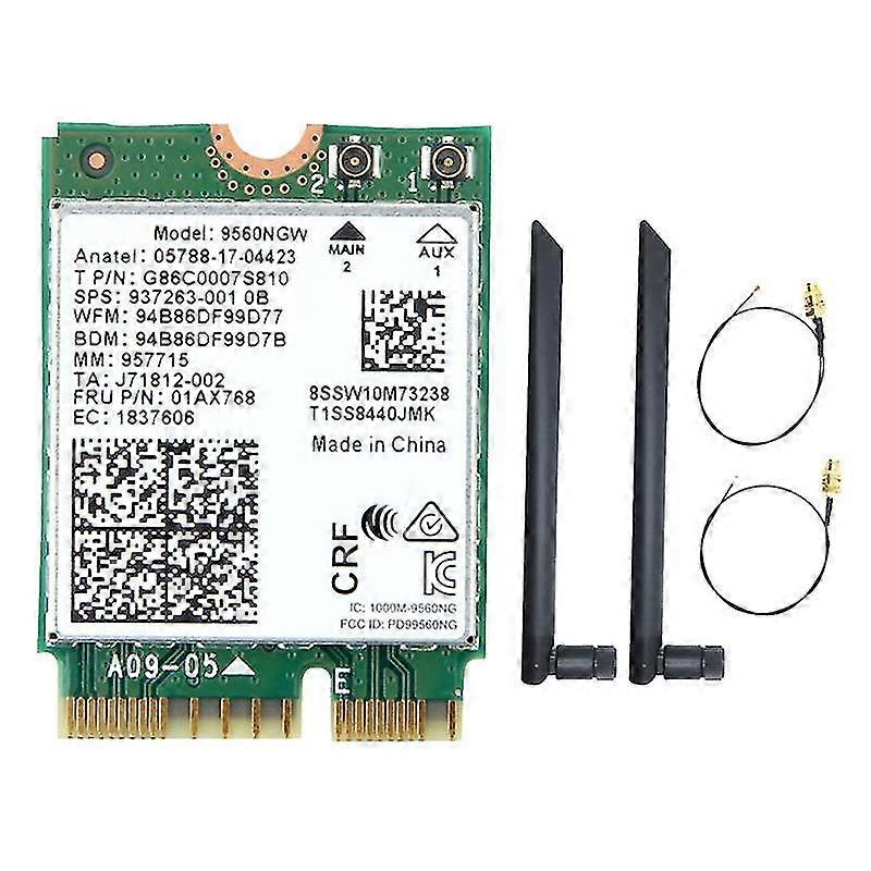 The Wireless-AC 9560 adapter is a CRF( RF module) supporting the integrated wireless 802.11ac solutions from . The solution provides Bluetooth 5 and 2x2 802.11ac Wi-Fi including wave 2 features such as 160MHz channels. These new features deliver a significant increase in user speeds in dense deployments, supporting fast downloads and long battery life compared to legacy 802.11ac devices. Combined with Core processors and exceptional wireless , the Wireless-AC 9560 can provide Gigabit wireless speed4 and dramatically improve your connected experience , work, or . Note: Even though you can insert these CRF to a standard M.2 Key E socket, they are only compatible with a system designed with the CNVi. Contact your system or motherboard manufacturer to verify compatibility. It currently only supports certain processors: For 8th Gen Core processors For Pentium Silver processors based on Lake Celeron processors based on Lake Model:For 9560NGW :937263-001 0B P:01AX768 Dual band:2.4Ghz / 5Ghz(160Mhz) Max speed: to 1730Mbps (The router must on 160Mhz) Bluetooth Version:Bluetooth 5.0 Interface:NGFF Key E, 22x30mm IEEE WLAN Standard:IEEE 802.11a/b/g/ac -MIMO:Supported Antenna diversity:Supported Radio ON/OFF control:Supported Connector Interface:M.2:CNVio Operating Temperature (Adapter Shield):0 to 80 (Celsius) Supported Operating Systems:Only work with Windows 10 Note:Not support Windows 7/8/8.1 Compatible With: It can be used on ////ISUS///Terransforce/Hasee etc. Not support for /// laptop. Due to different batches, the appearance and color of the product , but it does notaffect the use Colour:Green Material:PCB Package Contents: 1 * WiFi Card 2 * Antenna Only the above package content, other products are not included. Note: Light reflection and different displays may cause the color of the item in the picture a little different from the real thing. The measurement allowed error is +/- 1-3cm.