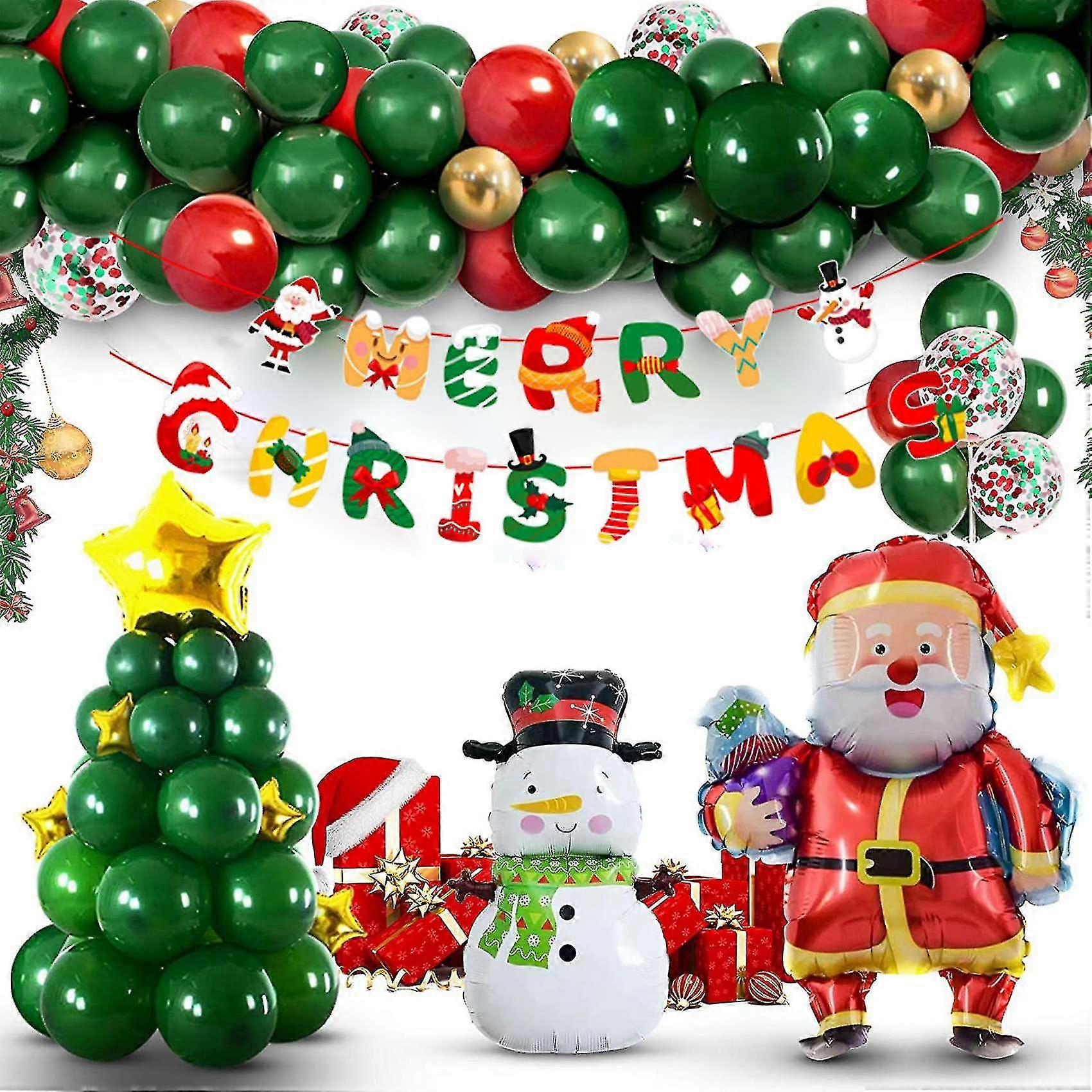 PREMIUM MATERIAL: and Santa Balloons are made of high quality material with self-sealing valve. The balloon is made of high-quality latex, which is sturdy and durable, weighs up to 3g, is absolutely harmless to the human body, and is a biodegradable material that will not pollute the environment. Rugged and durable, it supports helium or .EASY TO ASSEMBLE: First, inflate the balloons, then put the knots of the balloons into the balloon tape holes, one by one, you can glue the balloons to a one, they will be nice decorations.Christmas themed balloons are party, you can them from the ceiling, on the wall or on the window. Make balloons as an arch garland as a party background, a number of balloons have many decoration possibilities for an unforgettable and special Christmas party.Create a Christmas Mood: These Santa Balloons are Christmas-themed and perfect for decorating a Christmas party and creating a festive mood.Quick Assembly: The first step is to blow balloons of different shapes and sizes. In the second step, insert them into the plastic strips that make the garland. The third step is to the balloon garland in the shape you like. In just 30 minutes, you will have a beautiful Christmas balloon garland party backdrop.color:As shownMaterial:latexPackage Contents:1 x pull flag1 x balloon1 x Santa Claus balloon5 x red and green sequins balloon20 x 12-inch red balloon45 x 12-inch dark green balloon5 x 10-inch metal gold balloon5 x golden five-pointed stars balloon10 x 10-inch five-pointed Star balloon1 x Gold Ribbon1 x Balloon Chain1 x Dispenser1 x KnotterOnly the above package content, other products are not included.Note: Light reflection and different displays may cause the color of the item in the picture a little different from the real thing. The measurement allowed error is +/- 1-3cm.