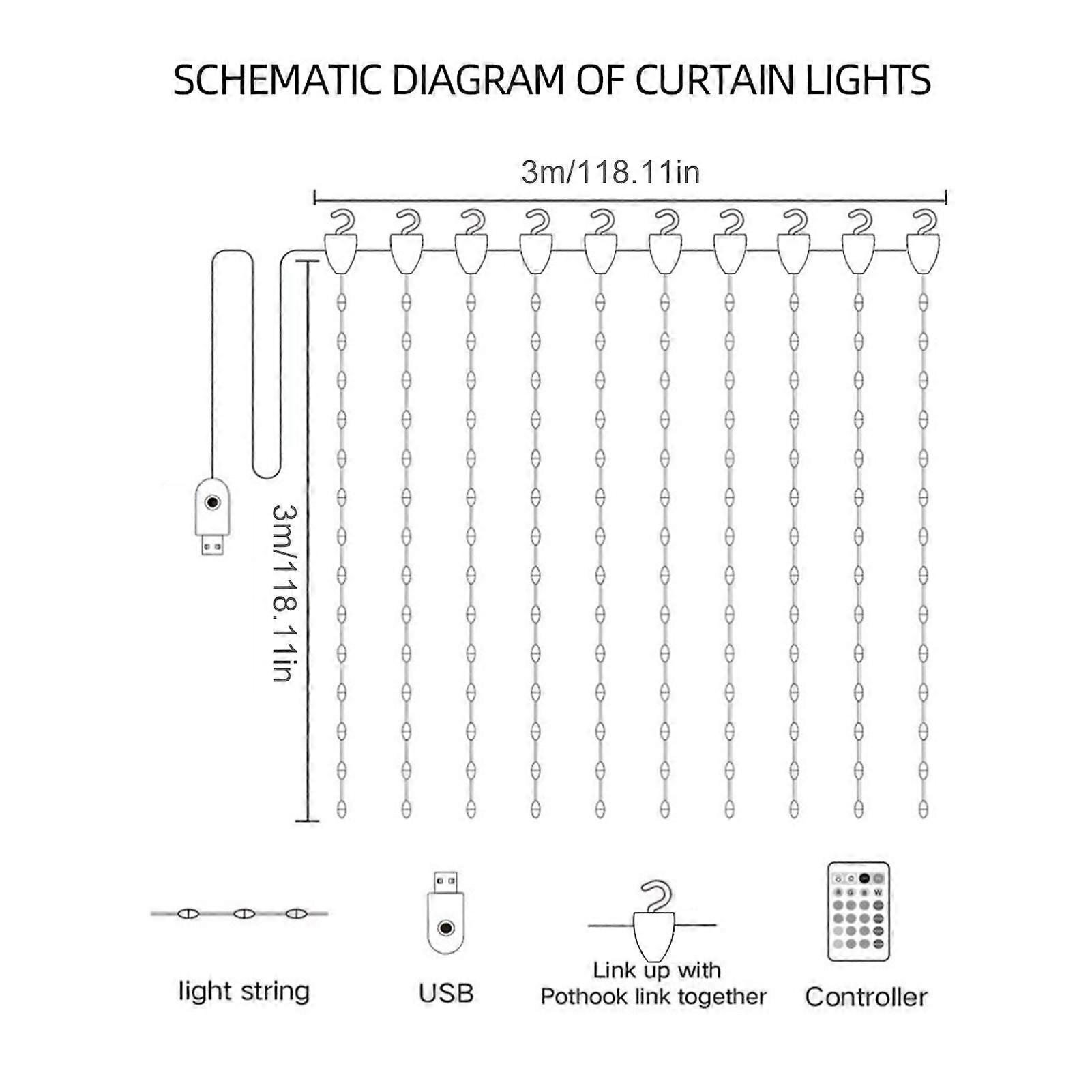 Bullet Points:1, 8 Different Flash Modes: Fancy light curtain built in 8 different flash modes for you to choose, such as combination, waves, sequential, slogs, chase/flash, slow fade, twinkle/flash and steady.2, 8 different flash modes: fancy light curtain built in 8 different flash modes for you to choose, such as combination, waves, sequential, slogs, chase/flash, slow fade, twinkle/flash and stable.3, Waterproof: The flickering string light LED Lights adopts three-wire copper wire, making them more durable and safe for daily use. IP65 waterproof function can be used outdoors even in rainy days.4, Easy operation: The light curtains are easy to operate and place, just plug the USB connector into a power bank, USB interface or charger, etc.5, Widely used: These LED curtain lights can be used for indoor and outdoor lighting. Perfect for Christmas, Festival, Party, Window, Walls, Doors, Curtains, Trees, Eaves, Balcony, Backyard, Bedroom, Patio, etc. The twinkle lights are also perfect as gifts for family and friends. Descriptions: The curtain LED lights are equipped with 100/ 200/ 300 RGB color changing LEDs and 10 LED strings, each string contains 10/ 20/ 30 LEDs. Perfect for home, bedroom, window, party, wedding, Christmas, Thanksgiving, Halloween, outdoor and indoor wall decorations. Features:1. 8 Remote Control Modes: Curtain hanging lights with 8 lighting modes, including steady, in waves, sequential, slo-glo, chasing flash, slow fade, twinkle flash, call and multiple brightness levels.2. The remote control and USB plug design make it more convenient to use in different places.3. IP65 waterproof, you can use the light curtain indoors as well as outdoor places. Specification:Name: remote control light curtainsColor: Colorful (RGB)Size:300leds-about 3m*3m/ 9.8*9.8ft200leds-about 3m*2m/9.8*6, 5ft100leds-about 3m*1m/ 9.8*3.2ftEffect: static 16 colors + 8 mixed colors + 4 flicker breathing + single color + mixed color + brightness/speed adjustable + countdown timer functionMaterial: transparent leather PVC wire (no knots/rust, waterproof and moisture-proof), 4020 lamp beads (larger light source, soft and not dazzling)Product Contents: 5V USB Power Adapter (2.5m lead)Waterproof Grade: IP65Power Supply: USBPuna: DC 5V USBlight Source: LEDLED LED Color: 16 ColorsWorking Time: 50000 Hours With Remote Control: YesPacking List:1 * Light Cord (With 10 Hooks)1 * USB Connector1* Remote Control1 * User ManualNote: Due to the lighting effects and shooting angles, there is a color difference in the product, please understand. Due to manual measurement, there is a tolerance in the size of the product. Payment methods:middot; You can make the payment using any of the above methods, and pls settle within 3 days of placing the order.middot; Your payment will be verified by