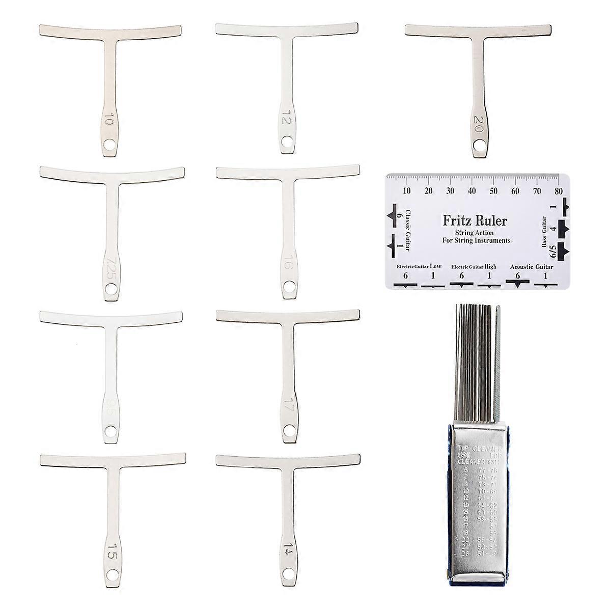 USAGE RANGE this tool set is suitable for measuring all kinds of electric & acoustic guitar, electric bass, electric box guitar fretboard that measured in radians to adjust the strings piano code. GUITAR BRIDGE SADDLE NUT FILES: 1.Made of high-quality steels, perfect tools filing string slots into nut and bridge. 2.With 0.4mm / 0.5mm / 0.6mm / 0.7mm / 0.75mm / 0.8mm / 0.9mm / 1.0mm / 1.05 mm / 1.1mm / 1.2mm / 1.4mm / 1.6 mm different size, 25mm grinding length and 30mm length of the hilt. 3.These longer-shaft files are easier to use than the shorter commonly available improvement stores 9PCS RADIUS GAUGE: Color: silver Material: Stainless steel 1 x 9 understring radius gauges ( 7.25, 9.5, 10, 12, 14, 15, 16, 17and 20) STRING ACTION GAUGE RULER: String ruler side: Material: plastic Size: 55mmx90mmx1mm Weight: about 10g Graduations displayed: mm and inches Measuring string height, frets, nuts, saddle, and other parts of a guitar Holding this card to the strings, you can visually find the suitable string height. ruler side: Could be used for gut guitars, electric guitars (raise or lower string height), acoustic guitars, and bass guitars (including six string bass guitars) to adjust space. Package Contents: 1 x 9PCS RADIUS GAUGE 1 x STRING ACTION GAUGE RULER 1 x GUITAR BRIDGE SADDLE NUT FILES Only the above package content, other products are not included. Note: Light reflection and different displays may cause the color of the item in the picture a little different from the real thing. The measurement allowed error is +/- 1-3cm.
