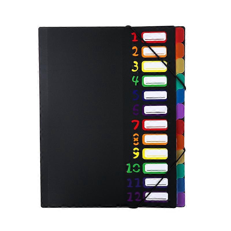 Classified Storage: The A4 expanding file folder has 12 compartments that can hold many things, and store different data or files in different categories, making it easier to find and not easy to lose, and make your office more convenient.LARGE CAPACITY - The size of the A4 expanding file folder is 320*250*15mm, offers 12 pockets and can hold many things that can be used for A4 paper, documents, recipes, cards, receipts and vouchers etc.Color Coding: Each compartment has a different color, so each section can instantly identify and find documents quickly, making your work or study more efficient.High-quality material: the A4 document folder is made of high-quality, environmentally friendly and durable PP with stable performance, waterproof and non-toxic, wear-resistant and heat-resistant, not easy to break and easy to clean, not easy to deform and very durable.Wide range of applications: A4 expanding file folders are versatile and ideal for home, office, study, travel, conferences and more. It is also an ideal gift for colleagues, friends, parents, children, keep the table clean and make life easier.Details:Material: PP.Size: 320 x 250 x 15 mm.Colour: black.Weight: 340 g.Package includes:1 x A4 expanding folder.Advantage:(1) The A4 expanding folder is made of high-quality PP, is waterproof and wear-resistant, easy to clean and the three-dimensional folding design is more durable and not easy to break.(2) The A4 expanding folder has a fastening strap that can effectively repair the folder page, prevent the loss of files or data and prevent the file from being damaged, ensuring the integrity of the data.