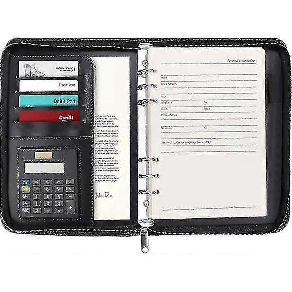 A5 Conference Folder with Zipper - Black Personal/Work Organizer - Business Travel Portfolio with Ring Binder, Calculator, Refillable Notepad Pages Y