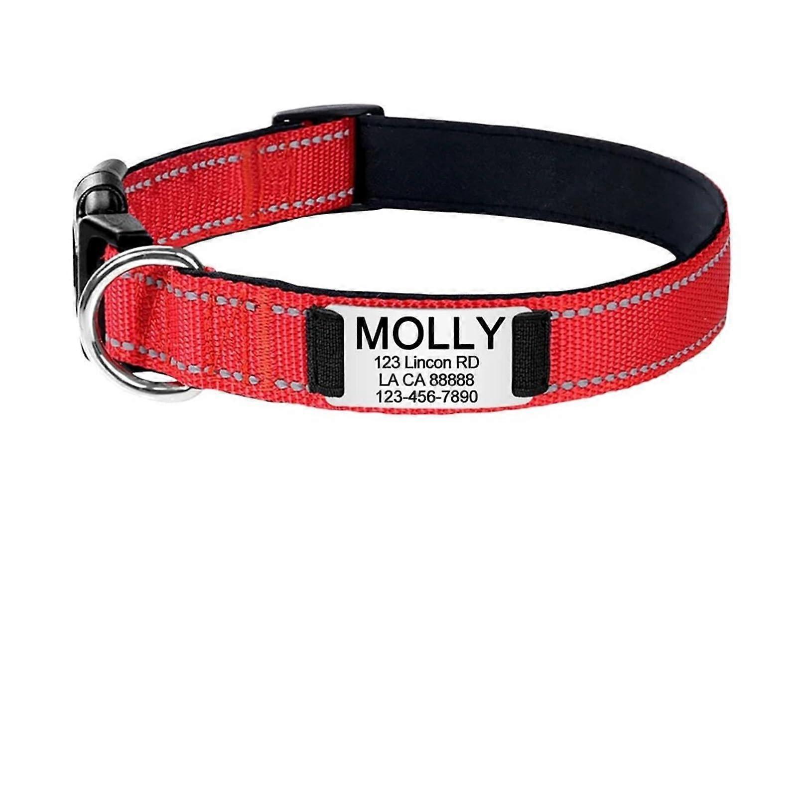 Adjustable Reflective Nylon Dog Collar With Custom Engraved Name ID Tag Glow Red, Size S 2538cm