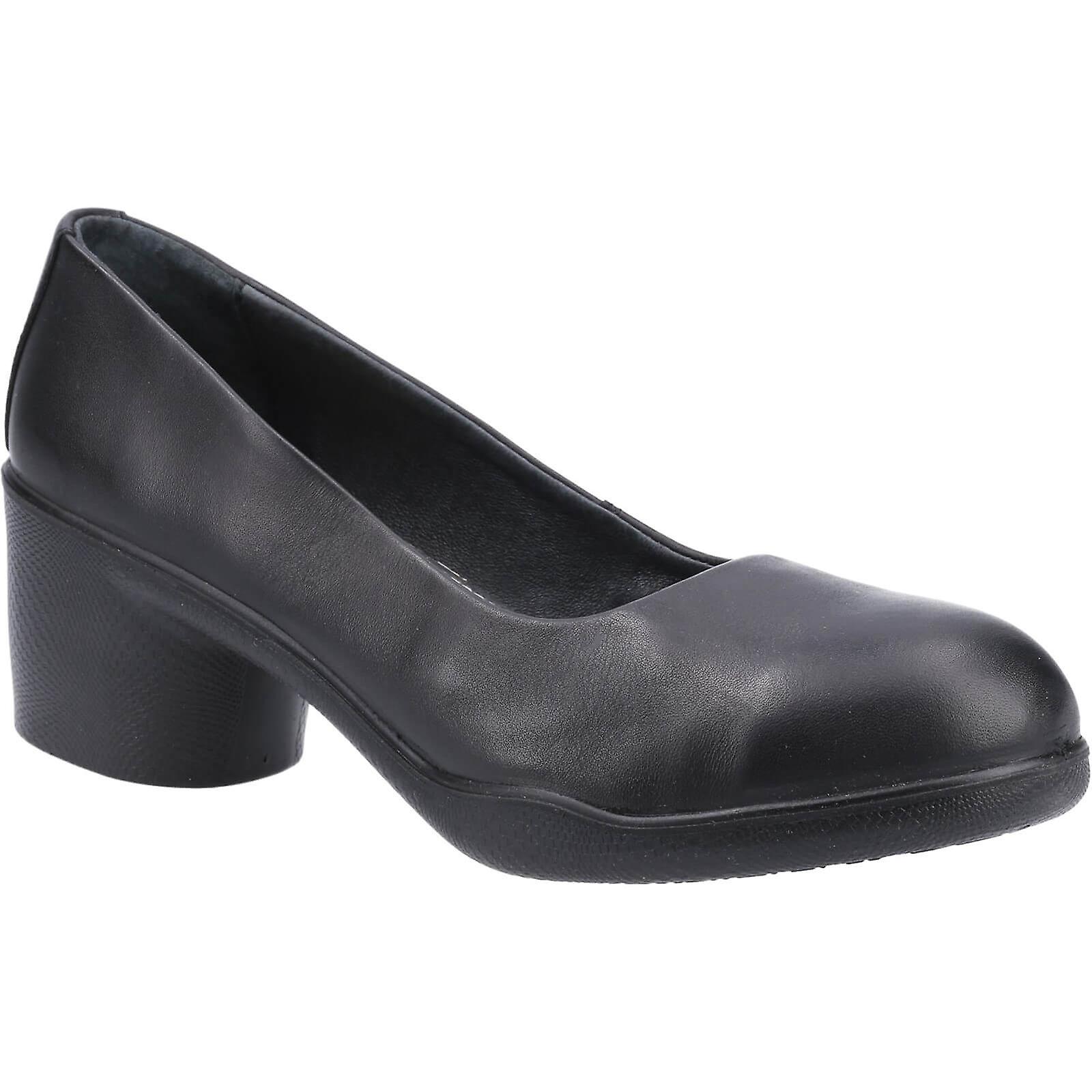 Key Features and Benefits Women's safety shoe in classic heeled court shoe design. Water-resistant full grain leather upper 200 Joule impact and compression resistant contoured steel toe cap Underfoot protection is provided by a lightweight and flexible composite midsole Cushioned leather lined padded insole Antistatic construction Slip-resistant PU outsole suitable for a range of surfaces where spillages can be hazardous Oil resistant outsole Transitions easy from the store room to front of house EN ISO 20345:2011 S3 SRC Fitting: Standard Fastening: Slip On Certifications EN ISO 20345:2011 SRC S3 Materials Upper Outer Material: 100% Leather Lining Material: 100% Leather Sole Material: 100% Polyurethane