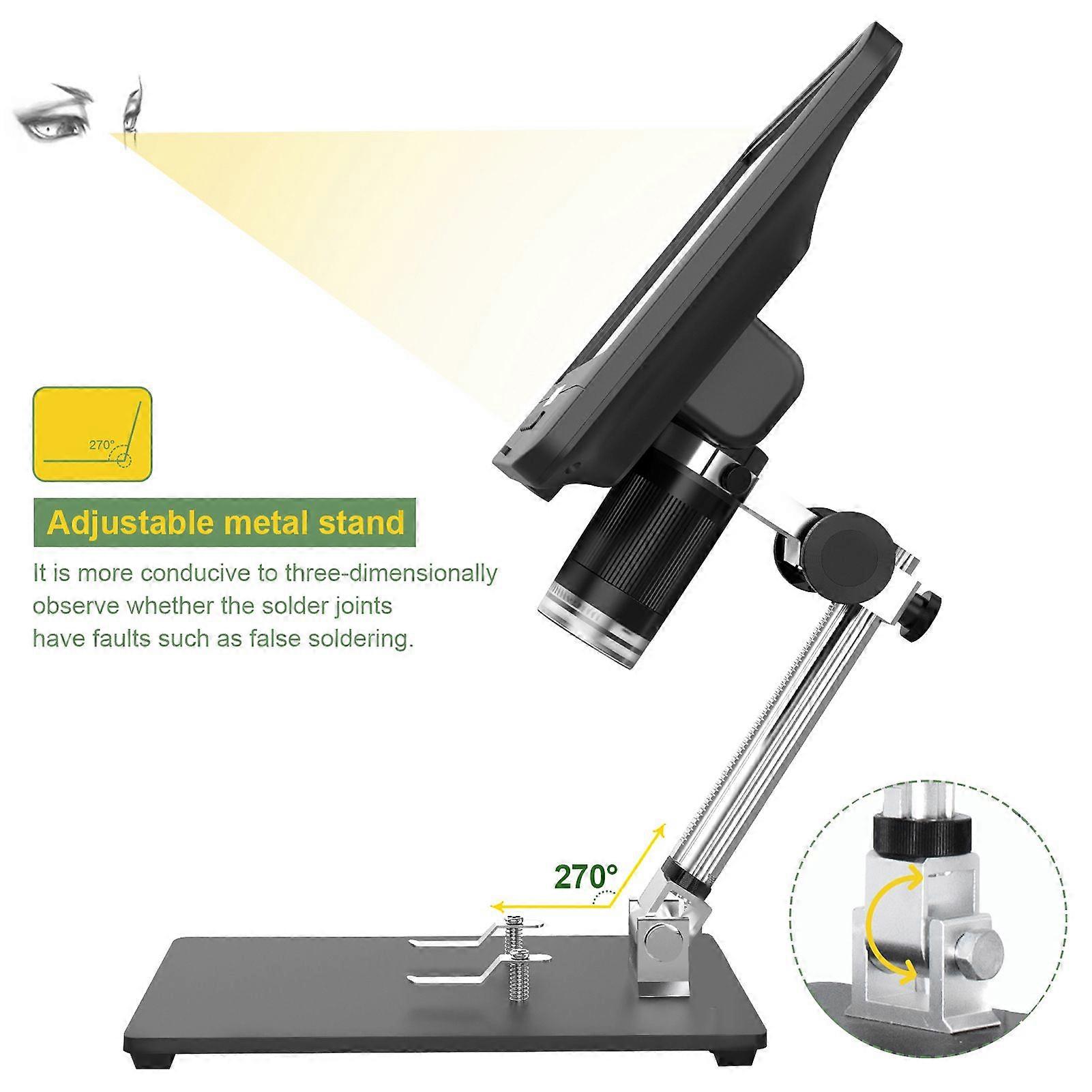 Feature:1. The product has an 8.5inch LCD screen, which is larger and displays clearer.2. The angle of the microscope display can be adjusted to facilitate multi-angle observation.3. The metal bracket can be adjusted front and rear, which can bring 3D visual effects and larger operating space.4. The metal black base plate, with a clip, can fix the observation item.5. The brightness of the 8 LED lights can be adjusted and the im-age is clear.6. Supports memory card recording and taking pictures, which is more convenient to use.7. Support 12 languages: Simplified Chinese, Traditional Chinese, English, Japanese, French, German, Korean, Portuguese, Spanish, Russian, Thai, Vietnamese.8. Products are widely used: re-pair of electronic products such as mobilephones and computers, anti-que identification, printed matter, textiles, jewelry, factory production lines, bid re-pairs, plant and in-sect observation, etc.9. There are two types to choose from. The first type has no battery and needs to be connected to the data line; the second type has built-in lithium battery. You can choose the one you want.Specification:This Digital Microscope has an 8.5inch LCD screen,and angle of the microscope display can be adjusted, with 8 LED lights can be adjusted and the im-age is clear, supports memory card recording and 12 languages, which can be widely used in our daily life. Come on and try it.Features:The product has an 8.5inch LCD screen, which is larger and displays clearer.The angle of the microscope display can be adjusted to facilitate multi-angle observation.The metal bracket can be adjusted front and rear, which can bring 3D visual effects and larger operating space.The metal black base plate, with a clip, can fix the observation item.The brightness of the 8 LED lights can be adjusted and the im-age is clear.Supports memory card recording and taking pictures, which is more convenient to use.Support 12 languages: Simplified Chinese, Traditional Chinese, English, Japanese, French, German, Korean, Portuguese, Spanish, Russian, Thai, Vietnamese.Products are widely used: re-pair of electronic products such as mobilephones and computers, anti-que identification, printed matter, textiles, jewelry, factory production lines, bid re-pairs, plant and in-sect observation, etc.There are two types to choose from. The first type has no battery and needs to be connected to the data line; the second type has built-in lithium battery. You can choose the one you want.Specifications:Material: ABS+metalType: type1,type2(optional)Im-age sensor: 2 mega pixels sensorVideo resolution: 1920x1080 30FPS, 1080P 1440x1080 30FPS, 720P 1280x720 30FPSVideo format: AVIMagnification: 5X-1200XPhoto resolution: max 12M(4032x3024)Photo format: JPGFocus range: 10mm-160mmFrame rate: max 30f/sStorage: memory card, up to 32G(not included)PC support: noPower source: USB Direct Current 5VBattery: 1 * lithium battery, 2200mAh(type1 not included, type 2 included)View size: 8.5 inchesScreen resolution: 1280*800Stand size: 200 * 190 * 120mm / 7.9 * 7.5 * 4.7inPackage size: 295 * 260 * 145mm / 11.6 * 10.2 * 5.7inPackage weight: 1650g / 3.6lbPacking list:(optional)Type11 * Microscope1 * Stand1 * USB Cable2 * Clip1 * User ManualorType21 * Microscope1 * Stand1 * Battery1 * USB Cable2 * Clip1 * User Manual Package List:(optional)Type11 * Microscope1 * Stand1 * USB Cable2 * Clip1 * User ManualorType21 * Microscope1 * Stand1 * Battery1 * USB Cable2 * Clip1 * User Manual