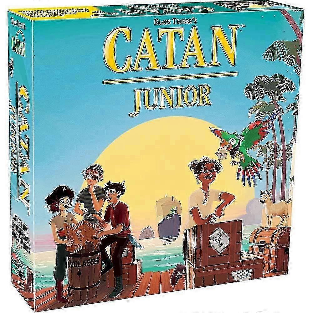 A Catan adventure for fledgling swashbucklers. Explore the Seas Catan: Junior introduces a modified playing style of the classic game giving younger players the opportunity to experience the world of Catan. Designed for players as young as 5 and is a perfect introduction to the Catan series of games for kids and families. Catan: Junior takes place on a ring of islands where 2 to 4 players build hideouts, and the mysterious Spooky Island, where the Ghost Captain lives. Each island generates a specific resource: wood, goats, molasses or swords and players can acquire gold. Each player starts with two pirate hideouts, then builds ships in order to expand their network. The more hideouts you build, the more resources you may receive. You use your resources to build ships, hideouts or get help from Coco the Parrot. Just watch out for the dreaded Ghost Captainch Be the first player to control seven pirate hideouts and you win the game. Junior Catan contains 106 die cut markers representing resources and specials, 4 player cost boards, 1 two sided game board, 28 Pirate hideouts (7 each of 4 colors), 32 Ships (8 each of 4 colors), 1 pirate ghost, 1 die, 1 tray, 1 box, 1 rule book.