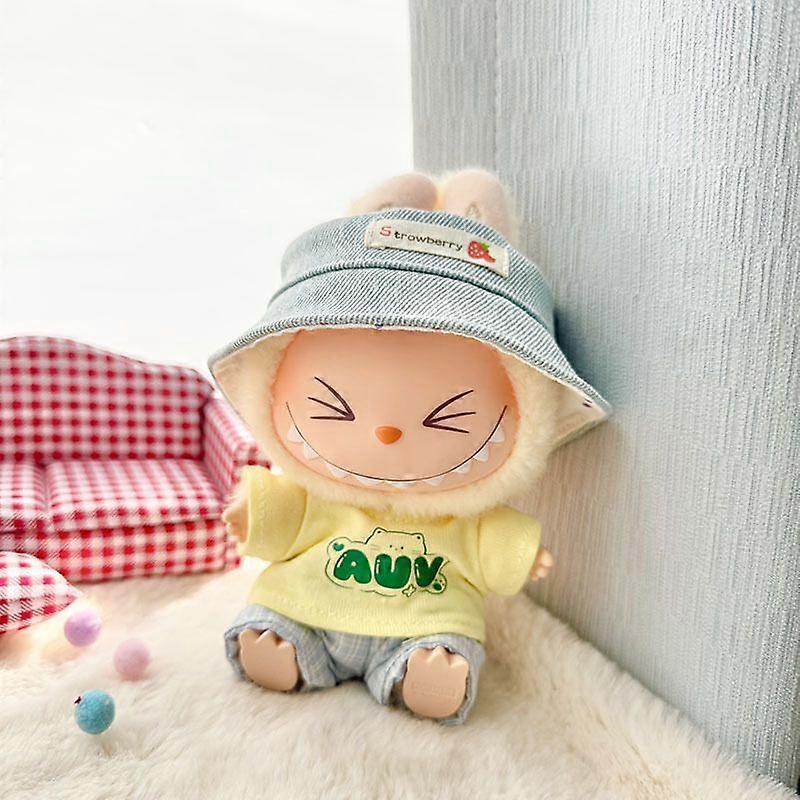 AU yellow shirt two-piece set + strawberry cowboy hat, first and second generation Labubu clothes pendant sitting doll clothes set (clothes only)