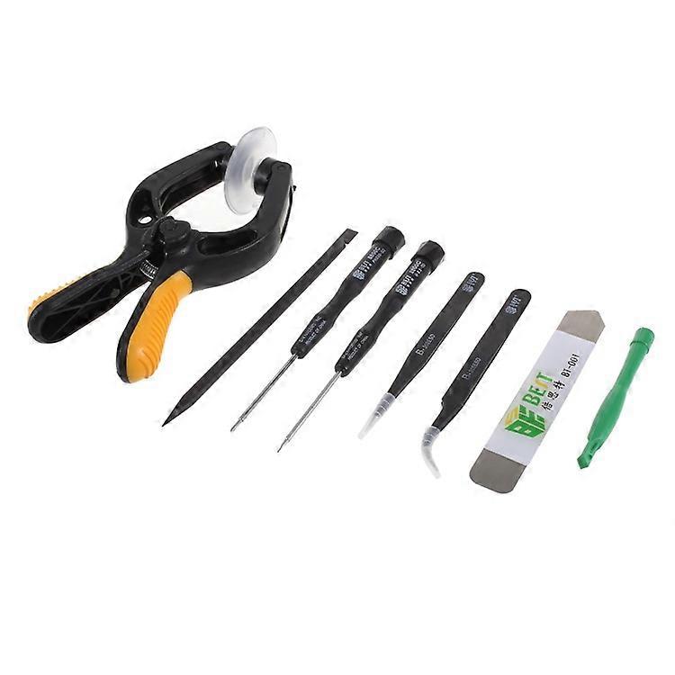 Professional mobile phone screen opening tool kit Include 1 x suction cup opening plier, 2 x screwdrivers, 1 x disassemble rod, 2 x tweezers, 1 x knife, 1 x pry bar Durable and wear resistant for long-time use Ideal for easily opening and repairing your phones without causing damages