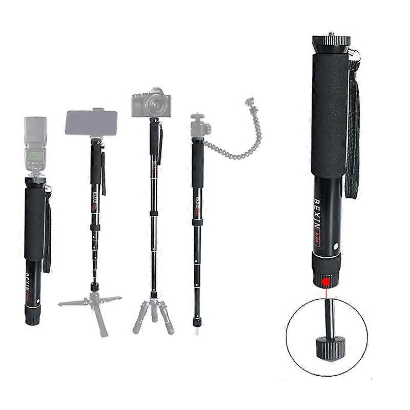 BEXIN P308 Portable Travel Outdoor DSLR Camera Aluminum Alloy Monopod Holder (Black) 1. Material: aluminum alloy 2. Large diameter: 30mm 3. Number of sections: 8 4. Contracted height: 28cm, fully open height: 160cm 5. Comes with 14 and 38 conversion screws, strong versatility 6. Invisible foot tube design, unfold quickly 7. Scalable design, easy to carry 8. Load bearing: 5kg 9. Non-removable foot pad 10. Applicable equipment: cameraSLRflash phonecard cameraLED light, etc.