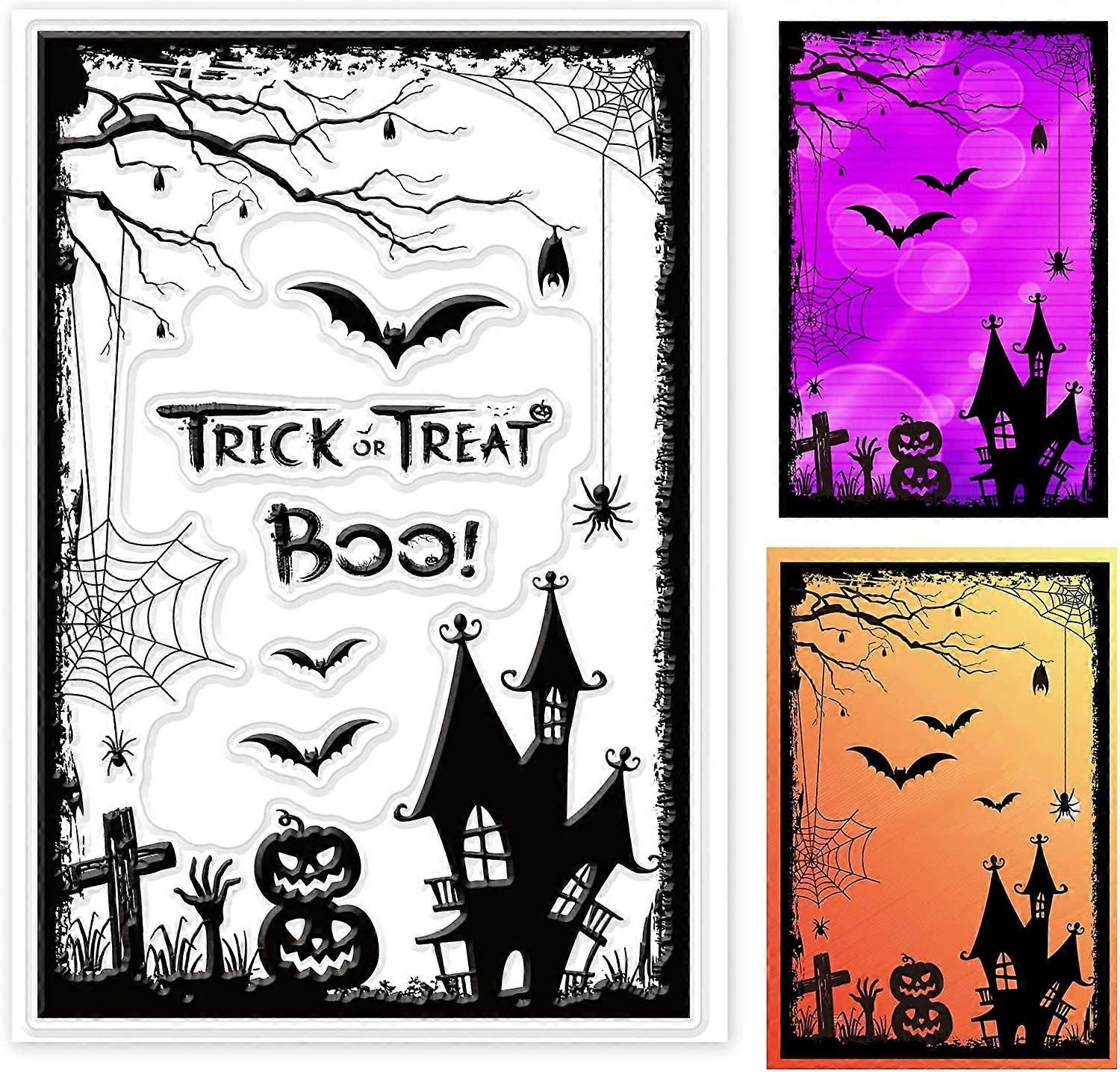 Pumpkins and Bat Silicone Clear Stamp Square Border Background Transparent Silicone Stamp Horror House Rubber Stamp for Scrapbook Journal Halloween Ca