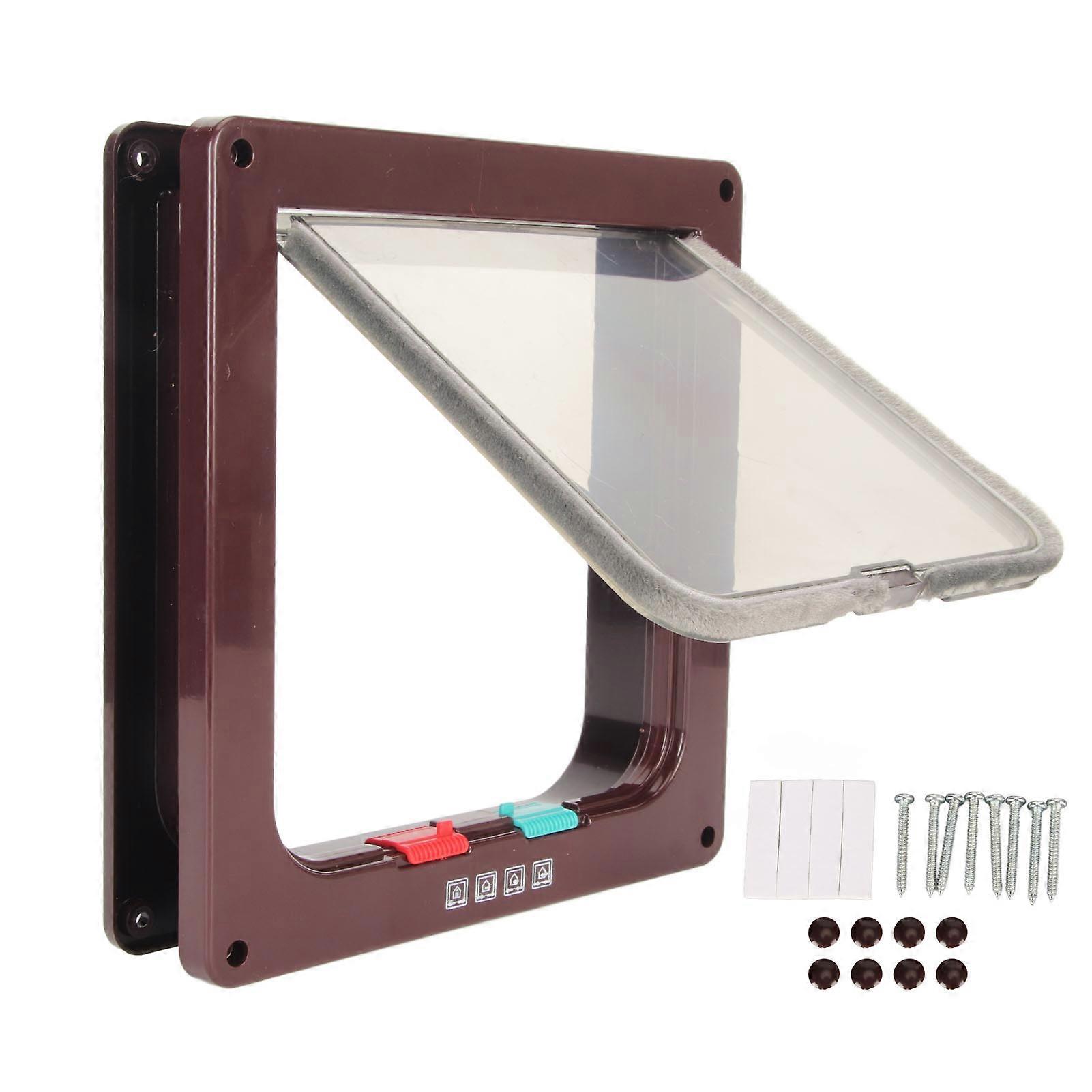 Features: 1.SECURELY FASTENED: Retaining grooves with snaps hold the silent brush bar securely in place, even if the brush bar falls off, it is easy to put it back into the retaining groove. 2.REDUCES NOISE: The gold and silver brush bars help reduce noise, minimize rain drops, wind or bugs, and pet entry and exit is silent. 3.4 WAY LOCKING: Cat flap door can be adjusted to 4 modes, out only, in only, in and out and fully locked with labeled red and green switches to easily control pet access. 4.EASY TO INSTALL AND USE: Pet door is suitable for installation on interior doors, exterior doors, wall, window, cabinets, glass, etc. To prevent pets from being mistakenly locked out of the home. 5.WEATHERPROOF: Weatherproof pet doors are made of ABS material, weatherproof, slippy and durable surface, not easy to be damaged, long service life. Specification: Item Type: Pet Door Material: ABS Use: Pets In And Out Of The Door PackageList: 1 x PetDoor 1 x Fixed Sticker (4 Strips) 8 x Screws 8 x Screw Cap