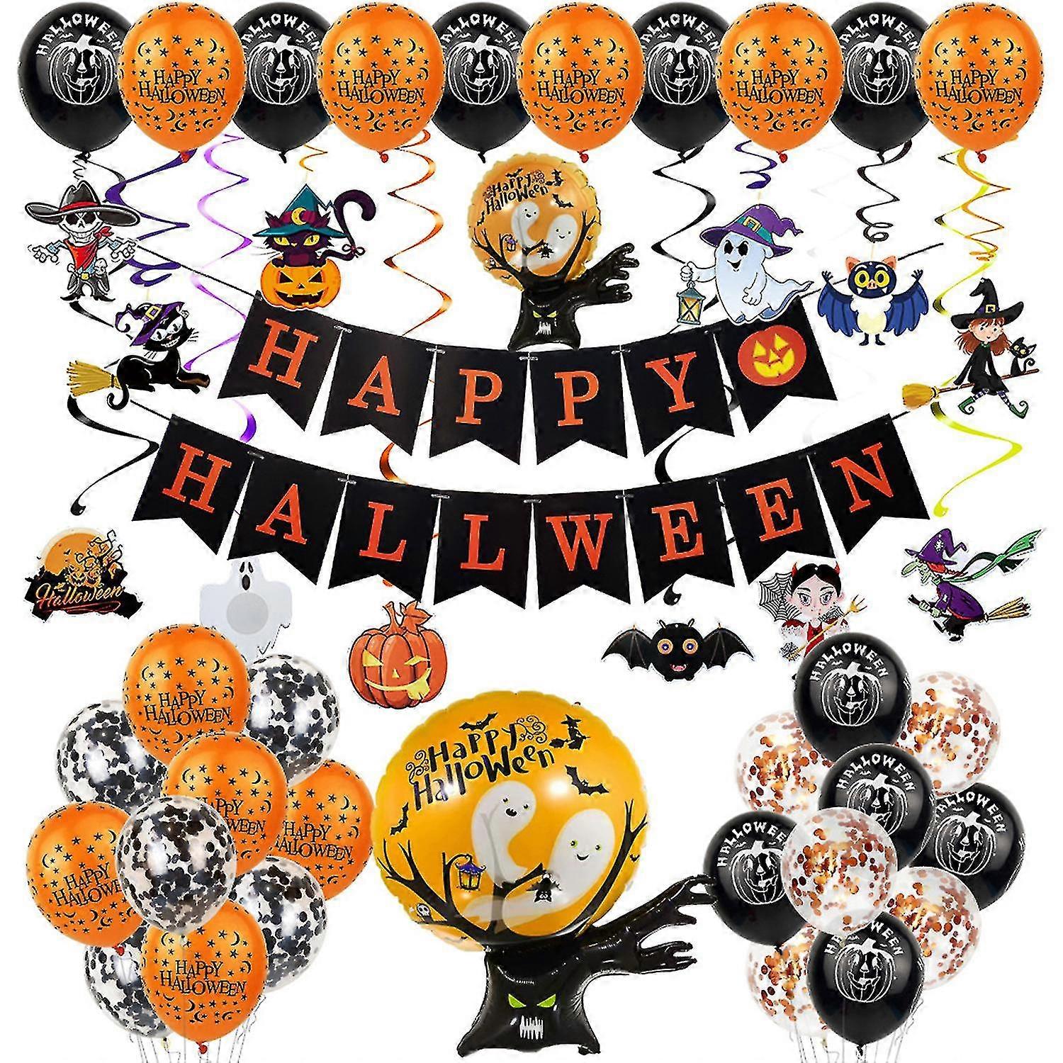 Cedc Halloween Balloon Decorations Set Hanging Happy Halloween Banner Pumpkin Spider Pattern Foil Latex Balloons For Kids Halloween Theme Party Backgr