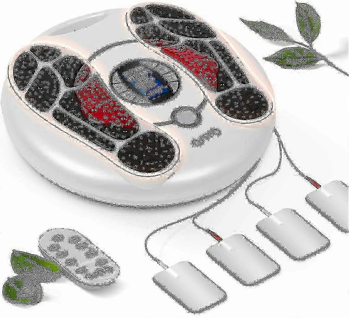 Foot Circulation Stimulator (FSA or HSA Eligible) EMS Foot Massager Feet Circulation Machine with 4 Electrode Pads TENS Unit for Sole Body Calf Leg Acupuncture Stimulation Therapy Relieve Nerve Pain FDA CLEARED CLASS II MEDICAL DEVICE - Our FDA certificate code is K133929 can be found on FDA official website. So you can buy our foot circulation machine with confidence TENS EMS TECHNOLOGY - Adopts electrical stimulation therapy to send a microcurrent impulse to neuromuscular, which is clinically proven safe and effective for feet and body treatment TWO RELAXATION TREATMENT SYSTEMS - One is for foot stimulator, the other is for body stimulator. 4 electrode gel pads, can be used to relax the parts of your body, such as Feet, Calf, Ankle, Legs, Hips, Back, Shoulder, Waist, etc. The two stimulation systems can be used together or separately 25 MODES 99-INTENSITY - 25 kinds of massage modes for sole or body to eliminate fatigue, 99 kinds of electromagnetic wave intensity to meet your required ideal result in a proper sequence. Automatic timer for every 25 mins. With sole massage roller on the device for Plantar Fasciitis No noise No vibrating Package includes 1X Infrared Remote Controller. 1X User Manual. 1X Power Adapter. 4X Electrode Pads