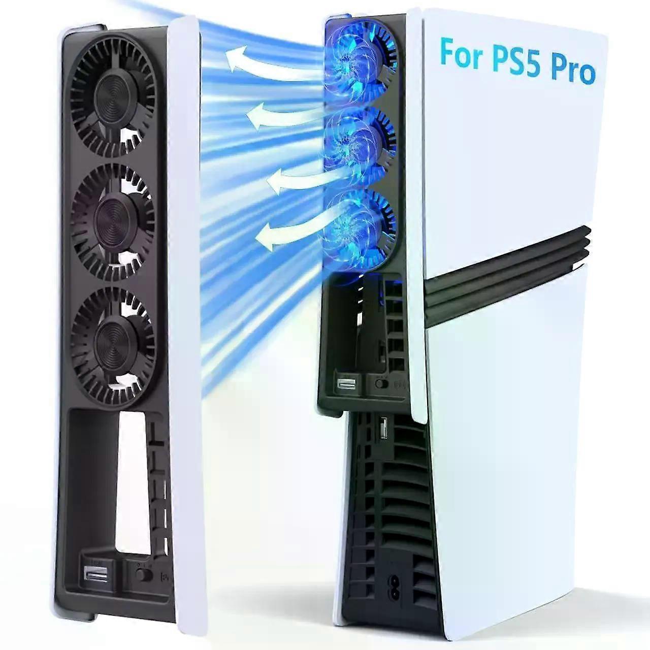 Features: Fit for PS5 Pro --- Designed exclusively for 2024 PS5 Pro Disc and PS5 Pro Digital consoles. Features precision-engineered airflow channels matching PS5 Pro's vents,surports vertical and horizontal placement of the ps5 pro console. Not compatible with any PS5/PS5 Slim models, confirm your console's bottom serial code starts with "PRO24" before purchase High-Efficiency Cooling Technology --- Equipped with three high-speed cooling fans, this Playstation 5 pro cooler system efficiently dissipates heat during intense gaming sessions. Reduces overheating risks, extends ps5 pro console lifespan, and maintains peak PS5 Pro performance Smart Control --- The ps5 pro accessories feature 3 customizable modes: Manual Off, Low-Speed Mode, and Auto-Adjust Mode. The rightmost mode, smart sensor, automatically adjusts fan speed based on real-time PS5 Pro temperature, then powers off completely when the console cools down—no wasted energy Convenient USB 3.0 Expansion Port --- Includes a built-in USB 3.0 port to connect ps5 pro accessories such as controllers, headset, hard drive, U disk, and more, without sacrificing console ports. Streamlined design integrates seamlessly with your PS5 Pro setup Whisper-Quiet Operation --- Engineered with noise-reduction technology, the ps5 pro cooling fans operate at near-silent level. Enjoy immersive gameplay without distracting hums or vibrations, perfect for late-night gaming sessions