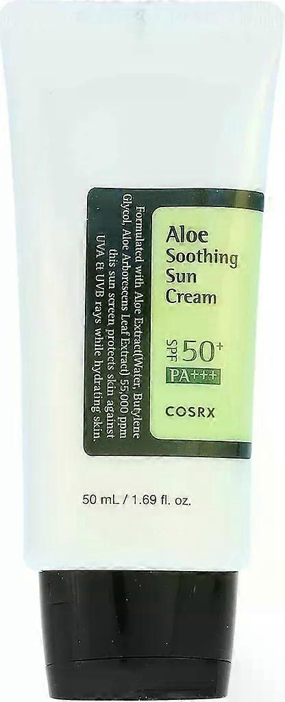 Soothing Aloe Sunscreen SPF 50 PA+++ is a sunscreen that combines moisture and sun protection with SPF 50 PA+++ and aloe leaf extract to keep skin hydrated even on the hottest days. It's also excellent for acne-prone skin. Properties: Sunscreen, soothing, moisturizes the skin, SPF 50, protects from the sun, ideal for acne-prone skin. How to use: Take a sufficient amount and gently apply it to the face, neck, and other sun-exposed areas of the body. Ingredients Water, Ethylhexyl Methoxycinnamate, Glycerin, Propylene Glycol, Cyclopentasiloxane, Bis-Ethylhexyloxyphenol Methoxyphenyl Triazine, Phenylbenzimidazole Sulfonic Acid, Dicaprylyl Carbonate, Isoamyl P-Methoxycinnamate, Potassium Cetyl Phosphate, Alcohol, Dimethicone, Glyceryl Stearate, Butylene Glycol, Titanium Dioxide, C14-22 Alcohols, Polymethyl Methacrylate, Cetearyl Alcohol, Aloe Arborescens Leaf Extract, Dipotassium Glycyrrhizate, Tocopheryl Acetate, PEG-100 Stearate, Silica, C12-20 Alkyl Glucoside, Dimethicone/Vinyl Dimethicone Crosspolymer, Aluminum Hydroxide, Stearic Acid, Caprylyl Glycol, Acrylates/C10-30 Alkyl Acrylate Crosspolymer, Carbomer, Xanthan Gum, Triethanolamine Sodium Hydroxide, Fragrance, Phenoxyethanol, Disodium EDTA. The composition of this product may change at the manufacturer's discretion. The current list of ingredients can be found on the product packaging. Our face and body care range features names from leading cosmetic brands. This product belongs to the tanning category and was specially developed for women with a 50 ml content. Facial care just got a little easier! Discover Cosrx Soothing Sunscreen SPF 50+, specially developed for sensitive skin. This highly effective sunscreen offers comprehensive protection against harmful UV rays with a high SPF of 50+. Thanks to its gentle formula, it soothes the skin and minimizes irritation while providing optimal protection. The cream absorbs quickly and leaves a pleasant, non-greasy finish, ideal for daily use. Enriched with nourishing ingredients, it ensures a comfortable skin feeling and helps maintain the skin's natural moisture barrier. Whether during a sunny outing or as part of your daily skincare routine, trust the reliable protection and soothing properties of Cosrx Soothing Sun Cream SPF 50+. Cosrx Aloe Soothing Sun Cream SPF 50+ is an ultra-hydrating hybrid sunscreen that absorbs quickly into the skin to protect it from sun damage and external aggressors. Formulated with aloe leaf extract, this sunscreen is so light it feels almost like a moisturizer. It absorbs quickly and leaves no white cast on the skin. Additon for you health & beauty Cosrx Aloe Soothing Sun Cream SPF50+ PA+++ The skin and body cosmetics in our range bear the names of the best-known cosmetic brands. This brand's product belongs to the tanning category and has been specially developed for women. This pack contains 50 ml of the product of your choice. Skincare just got easier!