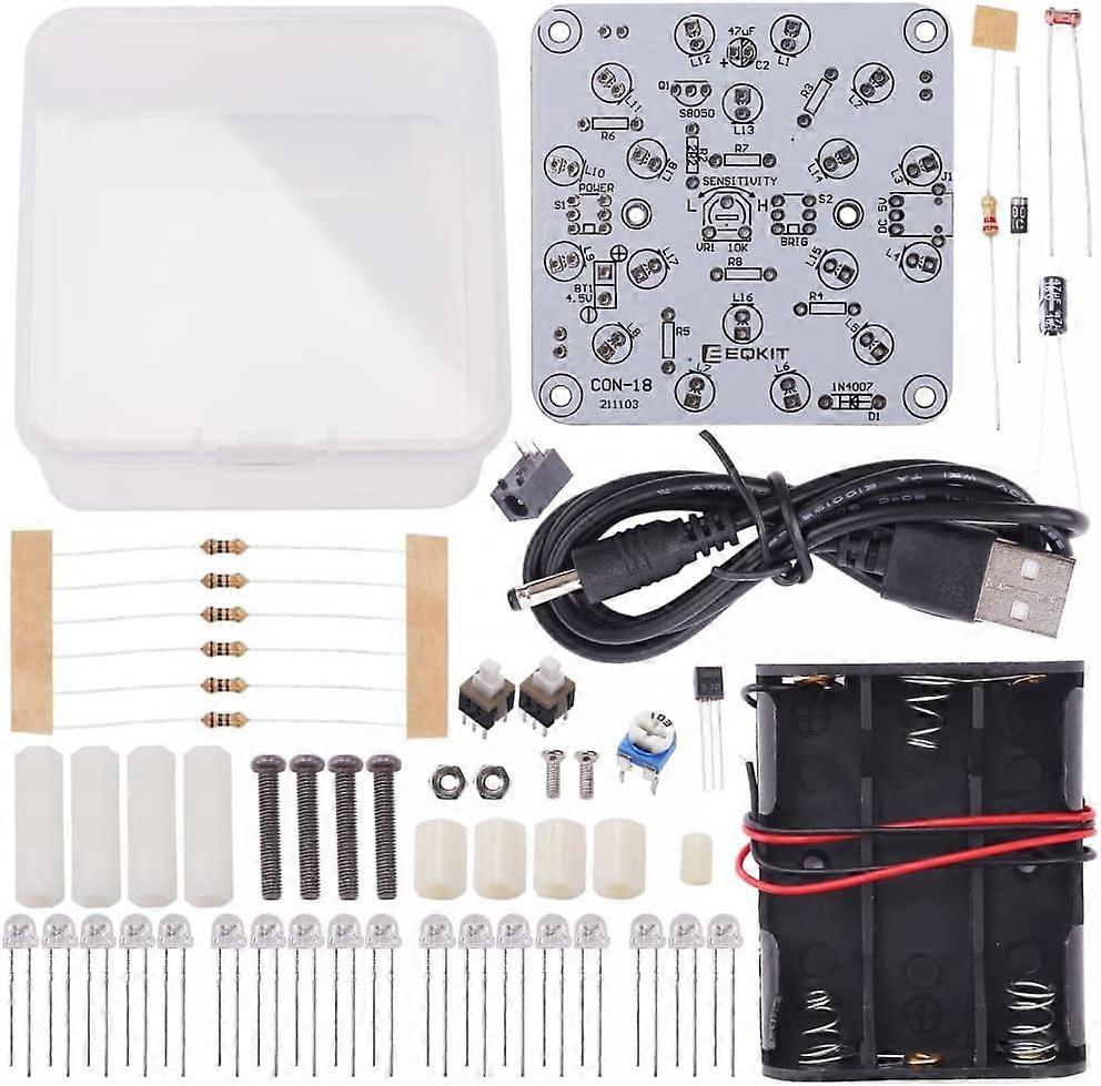 Introduction:1.CON-18 is a DC 4.5V-5V Photocontrol LED Lamp DIY Kit. It can not only adjust the brightness of the light through the built-in photoresistor sensor, but also adjust the brightness through the buttons, which is very suitable for different needs and scenarios.2.It is a very interesting DIY electronic product which enables users to understand the circuit more clearly and learn welding skills.Feature:1>.18pcs highlight LED2>.Perfect simple circuit3>.Two position brightness control4>.DIY hand soldering5>.Remote ControlParameter:1>.Product Name:CON-18 Photocontrol LED Lamp DIY Kit2>.Product Number:CON-183>.Work Voltage:DC 4.5V-5V4>.Work Current:45mA5>.Power Type:3.5mm Power Socket or AA*3 Battery Box6>.Work Mode:Switch or Photoresistor Sensor7>.Color:White LED8>.Work Temperature:-40~859>.Work Humidity:5%~85%RH10>.Size(Installed):65*65*35mmPackage List: 1X PCB Soldering Practice Learning Board