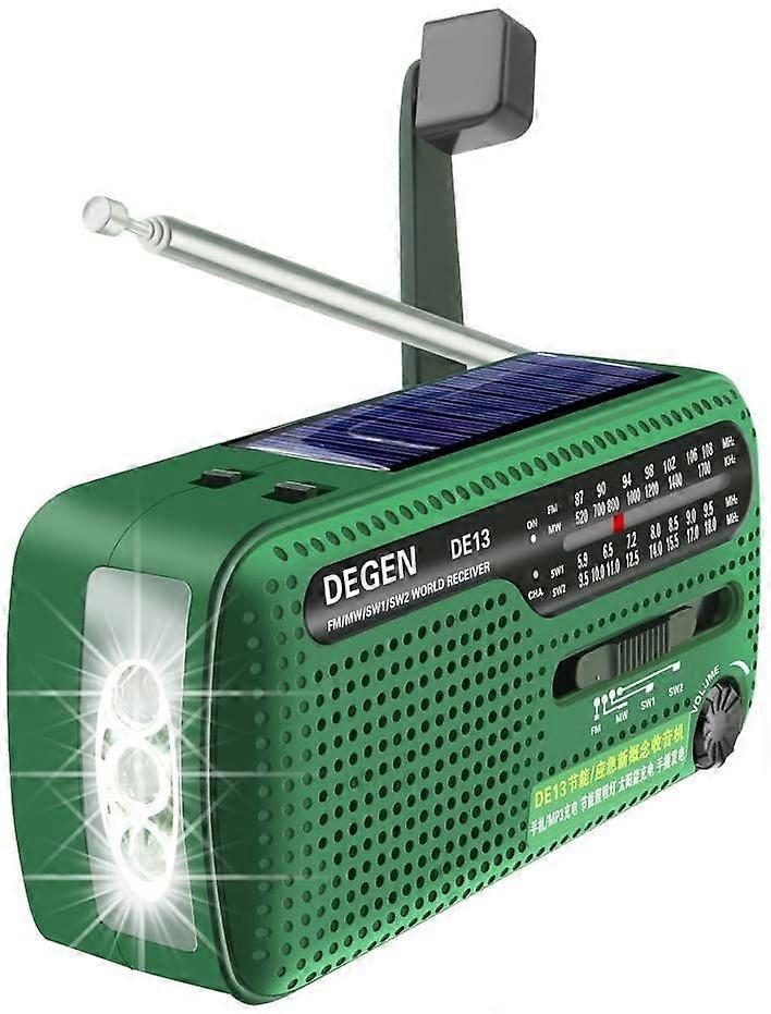 DE13 Cranked Solar FM FM AM SW Receiver with Bright Light Flashlight / SOS alarm / Rechargeable Mobile Phone for Emergency and Outdoor Activities (gre