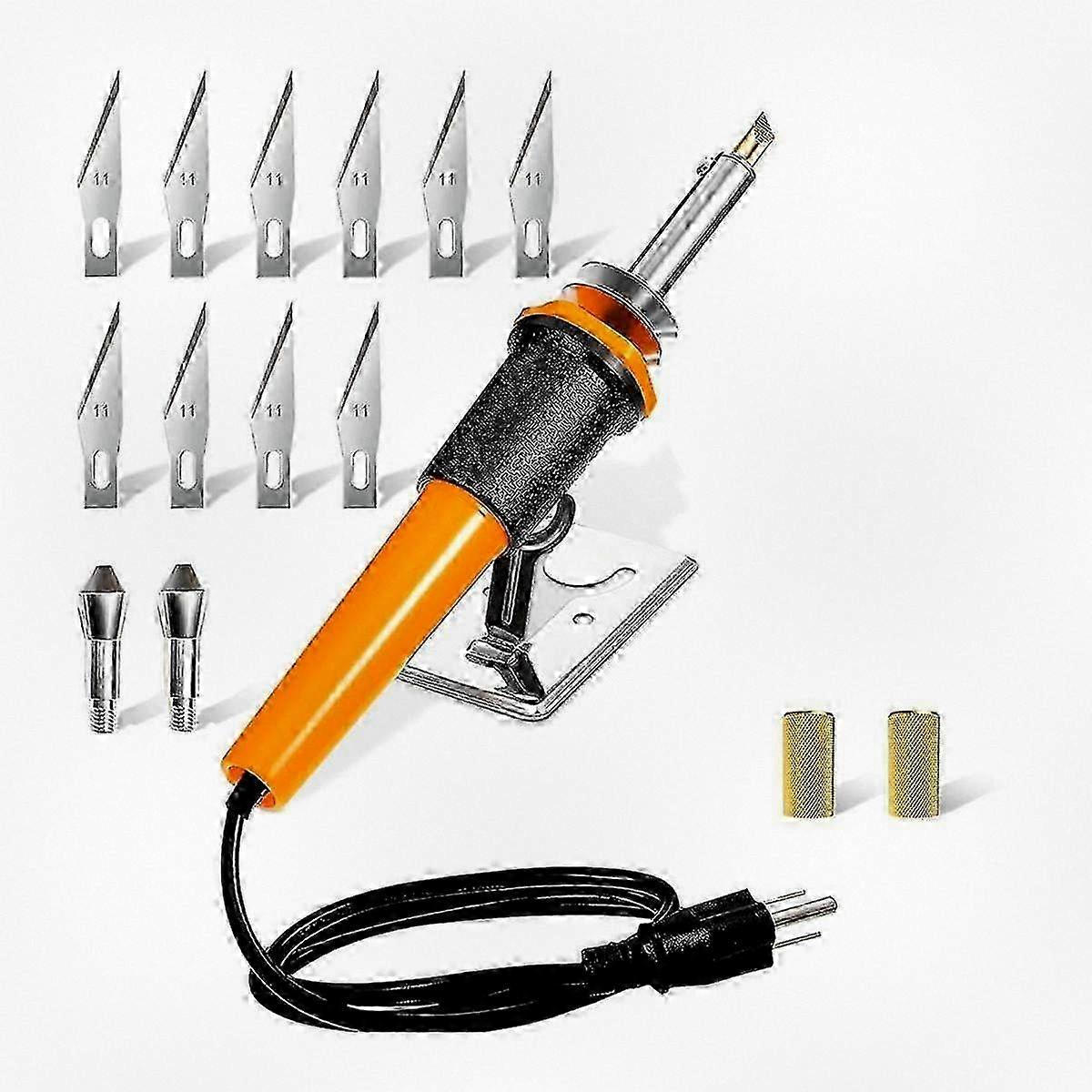 Hard plastic cutter tool includes 1 electric cutting knife pen with a metal st, 10 metal blades, 2 blade holders burning tip, it is ideal for cutting tasks. Power: 30 watts The plastic cutting tool is made from premium materials for durability long-lasting performance. The craft knife blades are precision-ground sharpened for accurate cuts stripping The hot knife cutter for plastic features ergonomic hles for a comfortable secure grip; the hle of the wood burner pen is slip-, reducing the risk of injury during use The wood burner tool is simple to operate. This electric hot knife cutting tool prevents the hle from heating, even as the nozzles reach 250C to 350C, allowing for easy operation Plug Type:US Plug,it applies to Canada, India,Mexico, Thail, the , the Philippines,Taiwan so on. Voltage:AC100-240V Soldering iron wire tail rom, don't accept the specified color Colour:As Shown Material:Metal Package Contents: 1 wood cutter for crafts set Only the above package content, other products are not included. Note: Light reflection different displays may cause the color of the item in the picture a little different from the real thing. The measurement allowed error is and\/- 1-3cm.
