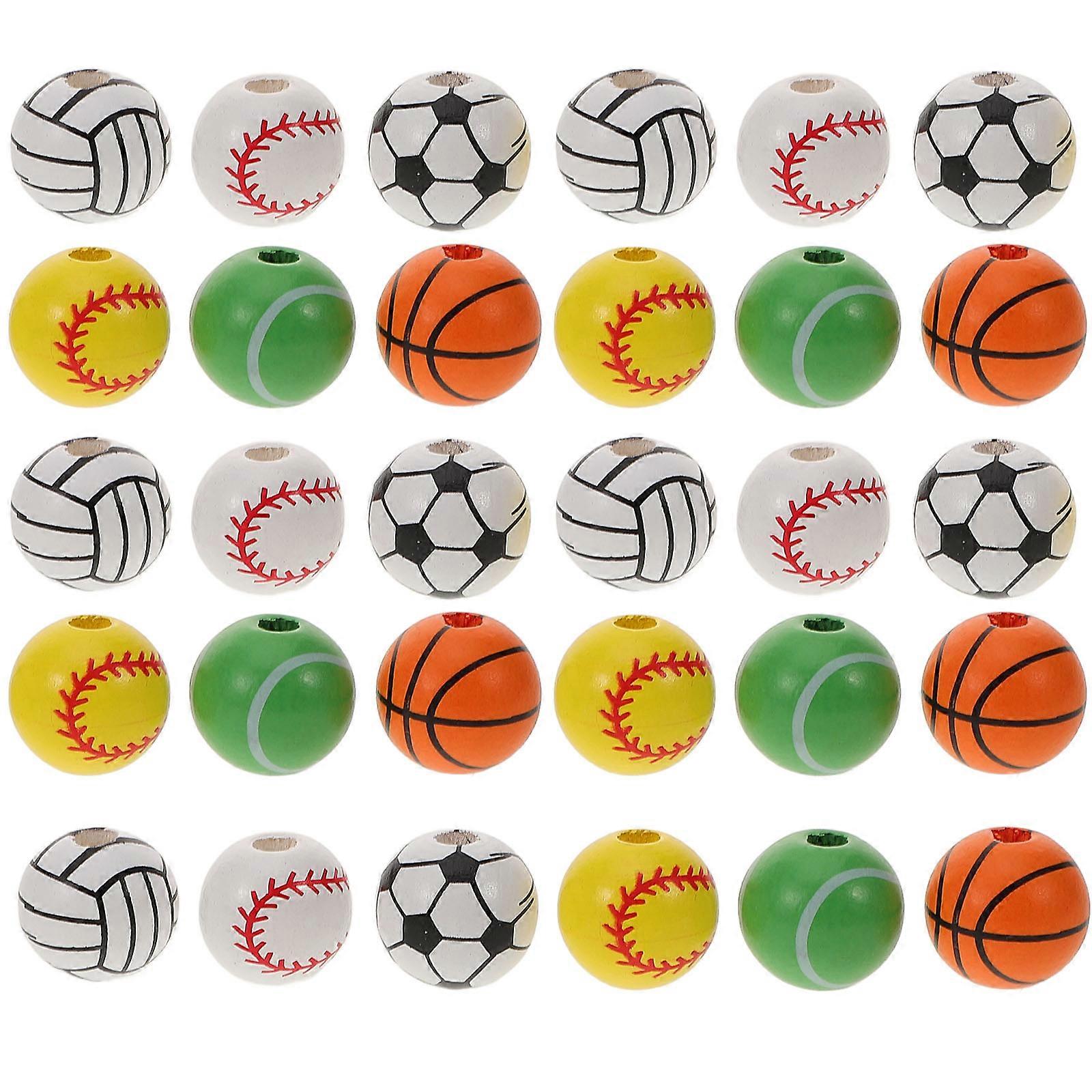 30pcs Wooden Sports Ball Beads for DIY Jewelry Making – Spacer Beads with Football, Volleyball, Tennis, Basketball, Baseball Designs – Craft Supplies