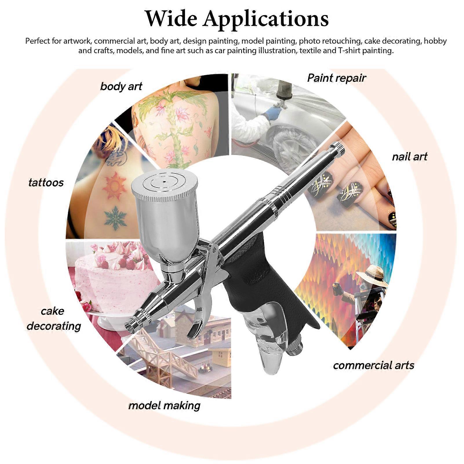 This professional airbrush has fine atomization effect, action trigger for easy and accurate spraying. It allows for more concentrated airflows and faster spraying speed, saving much more time than handmade drawing. Airflow adjustable design, perfect for artwork, commercial arts, body art, design painting, model painting, photo retouching, cake decorations, hobby and crafts, models and fine art such as car painting illustration, textile and t-shirt painting.