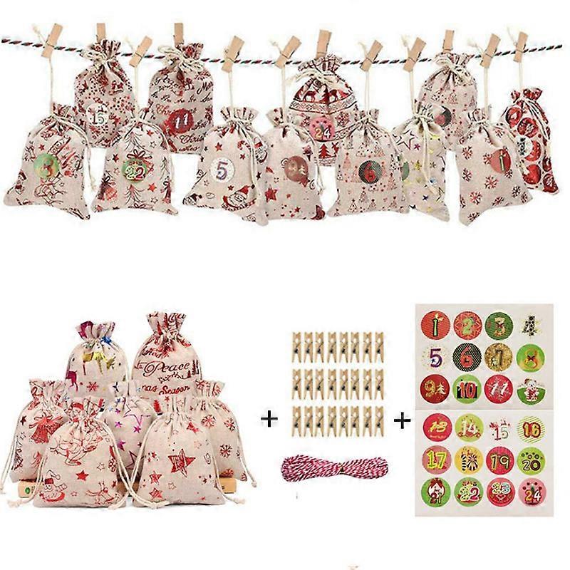 Product nameChristmas gift bag Product Inclusion 24 bags + 24 clips + 10 meters of two-color cotton rope + a set of labels Product weight]280 grams Product color12 colors (random color mixing) Specifications: Material: cotton, linen Application: Christmas decorations Size: about 10 x 14 cm Color as shown Quantity: 1 set Advent Calendar Bag with 24 Number Stickers that can be easily glued to the bag. Children are looking forward to Christmas, bring an unusual countdown atmosphere to your Christmas. Reusable calendar with easy-to-remove cord and pouch to protect gifts easily and securely, and can also be used as a bag for Christmas gifts. Perfect for hanging on the wall, Christmas tree, door, wall or fireplace, very eye-catching.