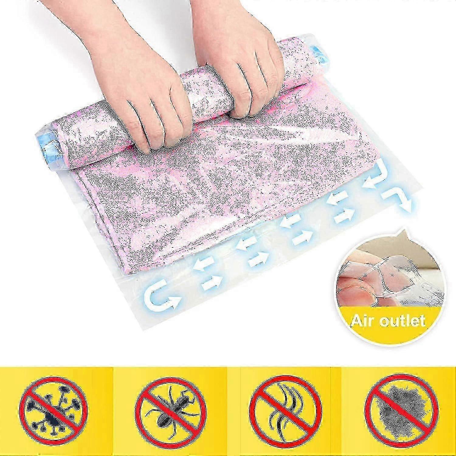 Package Included: 8 Travel Roll Up Storage bags (60x40cm), can create vacuum simply by rolling up the bags. They are perfect suitable space saving storage bags for trip, ideal compression bags for luggage. Easy to Use: Our travel vacuum bags do not require a hand pump or vacuum cleaner. You just need to manually roll the bags and then the air will squeeze out. Save 75% Storage Space for your luggage. Ideal Protection: Waterproof and airtight double zipper design protects your clothes from water damage, dirt and dust. Compression bags remove your excess air by hand rolling the air through a one-way pressure valve. Reusable and Durable: The vacuum storage bag is made of PA + PE material, which has higher stretchability and improved abrasion resistance, sturdy, tear-resistant.