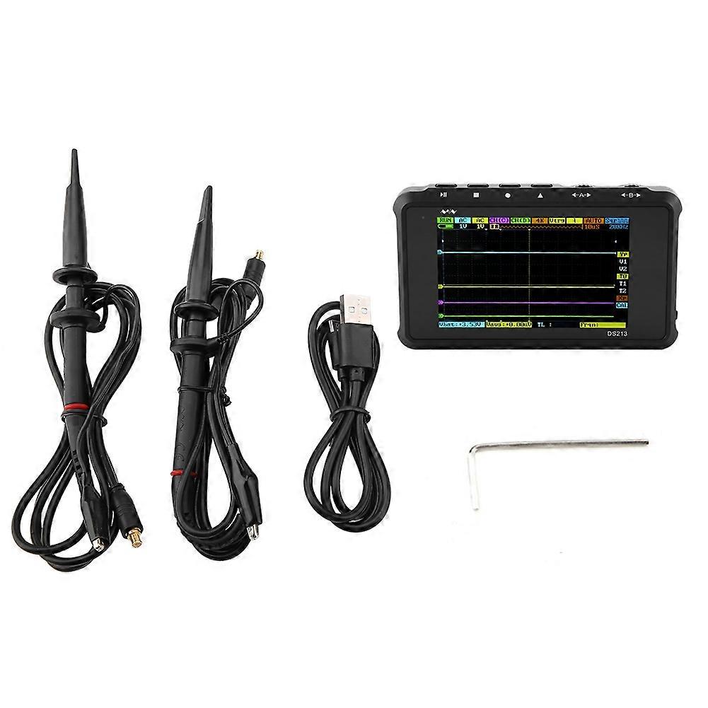 Overview: DS213 is a "5-track 4-wave line" digital storage oscilloscope for general purpose engineering and electronic task based on ARM Cortex M3 core DS213 using FPGA to manage external control of ADC and data cache mode. It provides 4 application partitions to load and update up to 4 different application firmware. It also has an integrated 8 MB USB flash drive to store waveform data and update the system firmware. The oscilloscope code application layer is open source, and users can develop the oscilloscope firmware according to their needs. Features: Compact size, light weight, easy to carry and operate. Waveform data can be stored, and waveform analysis and comparison are more efficient and intuitive. Multiple trigger methods, support positive and negative edge trigger, logic trigger, pulse width trigger. With built-in 8M USB disk, large storage capacity. Specification: CPU: ARM Cortex M3 FIFO & Control: FPGA ADC: HWD9288-100 Analog channels: 2 ( {CH_A} {CH_B} ) Digital channels: 2 ( {CH_C} {CH_D} ) Operation channel: INV {CH_A}, INV {CH_B}, {CH_A}+{CH_B}, {CH_A}-{CH_B}, {CH_C} & {CH_D}, {CH_C} | {CH_D} Vertical Sensitivity: 10 mV-10 V / div (1-2-2-5 Step) (using x1 of the probe) 100 mV-100 V / div (1-2-2-5 Step) (using x10 of the probe) Vertical Resolution: 8 bits Storage depth : 4 channels, 4*4 K Input coupling mode: DC, AC ± 400Vpp (using x10 of the probe) Soft trigger type: positive and negative edge trigger, pulse width trigger, logic trigger Trigger mode: automatic, standard, single, instant scan Trigger Source: {CH_A} {CH_B} {CH_C} {CH_D} Signal source: square wave 10Hz to 8 MHz, in total 20 changes and 3 sources of Vpp signal; Sinusoidal / triangular / sawtooth wave: 10Hz to 20 MHz, in total 11 changes and 3 Vpp signal sources Storage capacity: bulit-in 8M USB disk File types: BMP,BUF, CSV Automatic measurement type: maximum value, minimum value, crest value, average value, effective value, frequency, period, pulse width, duty cycle Cursor measurement: time value, amplitude value Display mode: (4 wave lines) Line 1: {CH_A}, HIDE Line 2: {CH_B}, HIDE Line 3: {CH_C} REC_1, REC _ 2, REC _ 3, REC _ 4 hide Line 4: {CH_D}, {CH_A} + {CH_B}, {CH_A} - {CH_B}, {CH_C} & {CH_D}, {CH_C} | {CH_D}, HIDE Sampling mode: Real-time sampling Sampling frequency: 100MSa / s Battery: 1000mAh Certificate: CE FCC Weight: 296g/10.4oz Size: 99.5*58.5*13.5mm/3.9*2.3*0.5inch Model DS213 MCU STM32F103VE ADC HWD9288 Channel Number 2 analog channel +2 digital channel AnalogBandwidth 15MHz MaximumSampling Rate 100MSa/s Maximum Storage Depth 4K Horizontal Scanning Frequency 100nS/Div~1S/Div(1-2-5 Step) VerticalSensitivity 10mv/Div~10V/Div(1-2-5 Step) Input Impedance 1MΩ CouplingMode DC/AC Trigger Type up / down trigger positive / negative pulse trigger logic trigger Automatic Adjustment Mode No OperationWaveform INV A, INV B, A+B, A-B, C&D, C|D, RecA, RecB, RecC, RecD SignalOutput Square wave, sine wave, triangle wave, saw tooth wave Trigger Mode Auto, Normal, Single, Slow MeasuredValue Storage Built-in 8M USB disk Number of available APP quantity 2 Operation Keys, Encoders USB Interface Micro USB Battery 1000mAh Screen Size 3inch Screen Resolution 400*240 OpenSource Situation Application layer open source Certificate CE/FCC Package List: 1 * Mini Oscilloscope 1 * USB 1 * Screwdriver