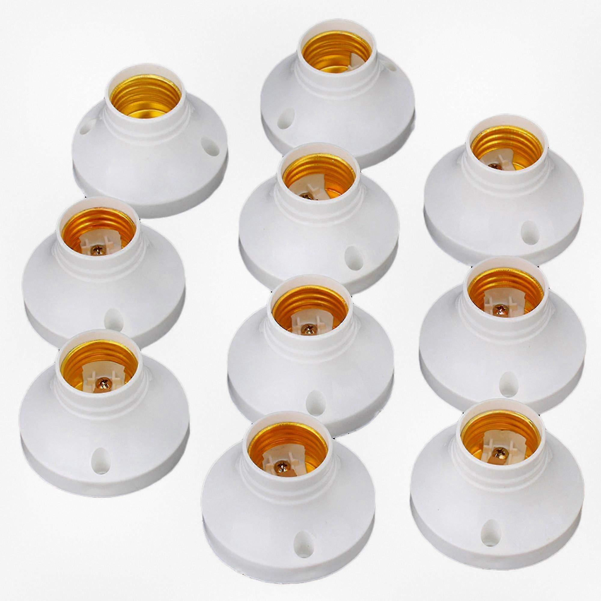 Note: The color of the item may vary slightly due to photography and your own computer. Feature: This Lamp Socket showcases a compact and simple design that is both practical and useful. It features a round body with screw terminals, making it suitable for a variety of fixtures, signs, and displays. The Light Bulb Holder is easy to use and allows for the continued use of conventional light bulbs or compact fluorescents instead of the small candelabra-based bulbs with this Plastic Lamp Socket. It is ideal for light bulbs or lights with candelabra sockets that require conversion to a standard medium base. Specification: Model: E type lamp holder (E27 round base) Material: high-grade plastic + metal conductive sheet Color: White Parameters: AC220V 50Hz / 60Hz Connection: connection type Size: Diameter: about 63mm/2.48inch Height: about 40mm/1.57inch Weight: 195g Package Include: 10 x E27 Round Base Holder