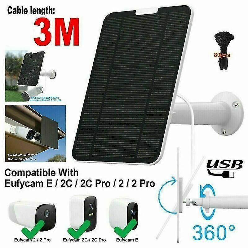 Features: CHARGE YOUR DEVICES: solar panel for Eufycam 2/2 Pro/2C/2C Pro/E, a few hours of direct sunlight every day would keep your camera charged around the clock; No more battery changing, no more power adapter needed. EASY INSTALLATION: simply mount the solar panel outside your house facing direct sunlight, connect to your Eufycam E / Eufycam 2C with the micro USB connector.3.0 m long charge cable, wall mount, and screws are included. WEATHER RESISTANT SOLAR PANEL: this Eufycam solar panel surface is made of polycrystalline silicon, waterproof design, operating conditions is -5F to 120F (-20C to 48C) FLEXIBLE ADJUSTMENT: secure mounting bracket can adjust in 360 degree to capture the sunlight in different seasons; Continuous power your camera in maximum efficiency. Packing list: 1 x solar panel 1 x 360secure mount bracket 1 x 3.0M/ 11.8ft cable 3 x screws 80 x Covered cable tie If any of our products fail to meet your expectations, please get in touch with us and we will try to resolve the issue.