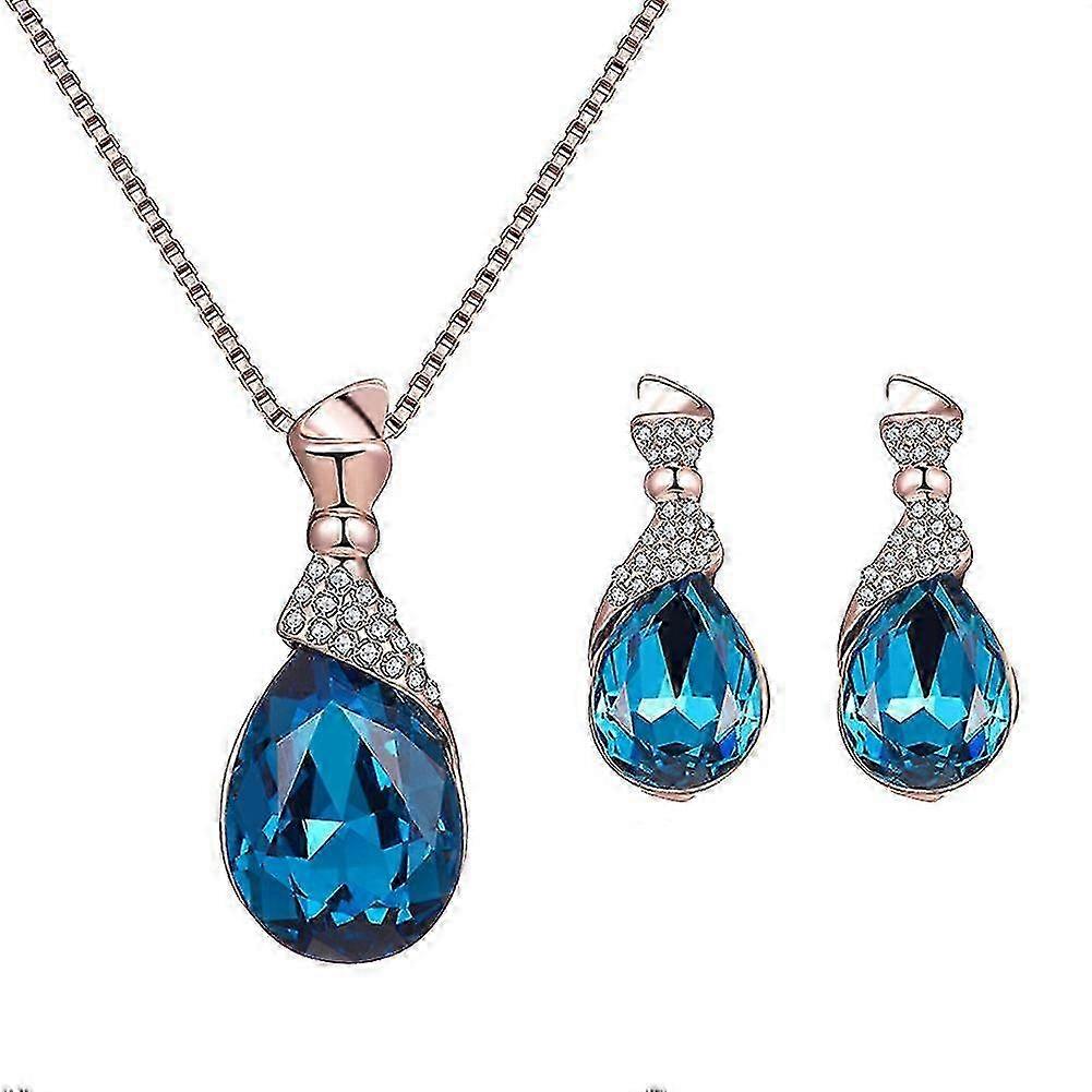 Farfi Women Water Drop Shape Rhinestone Pendant Ear Stud Earrings Necklace Jewelry Set