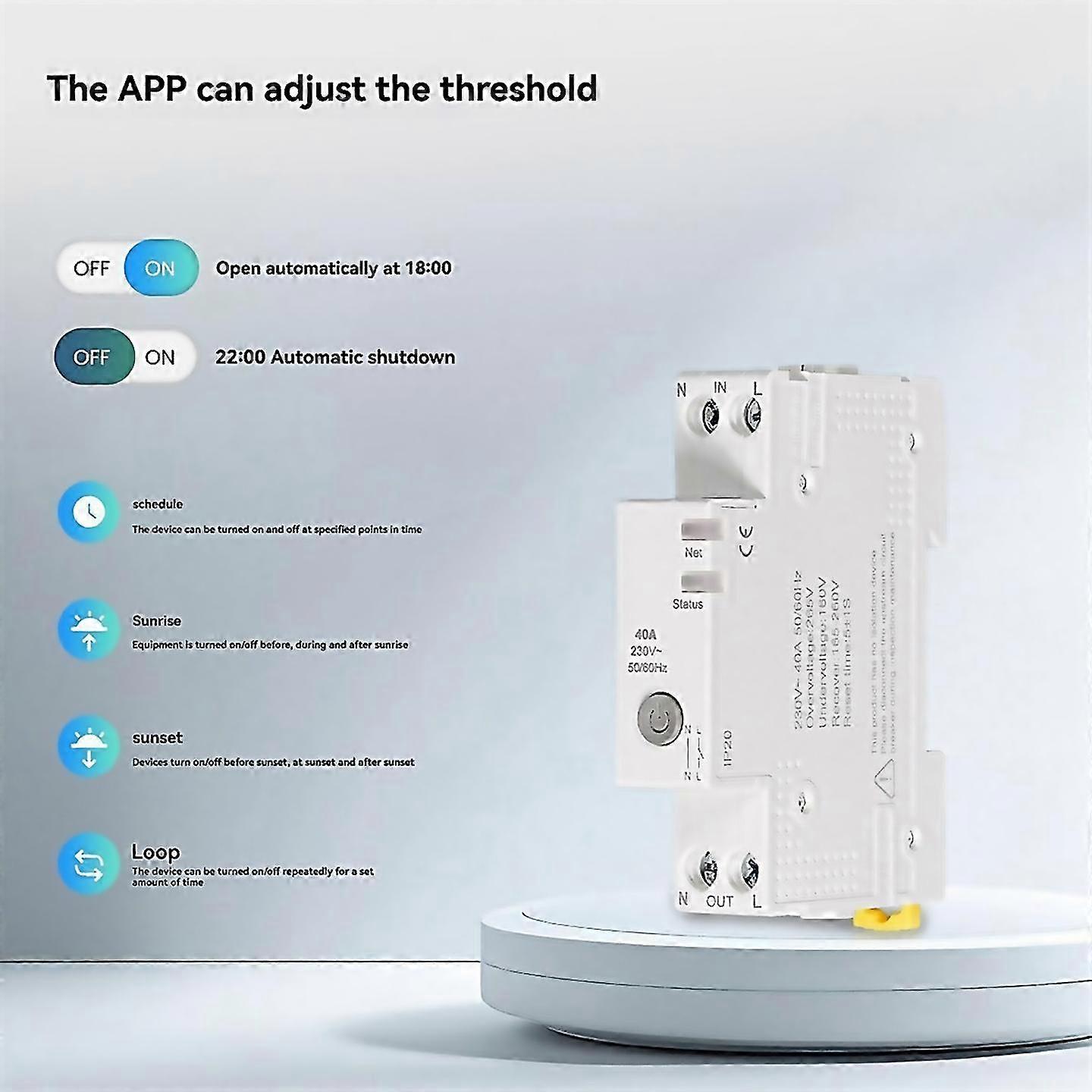 Fangrui Product Details Fangrui Product Details 1. Real-time Power Consumption Monitoring: Real-time Tracking Of Power Consumption, Helping Users To Effectively Manage Energy Use. 2. Comprehensive Alarm System: Provides Overcurrent, Overvoltage And Undervoltage Alarms To Circuit Safety. 3. Relay Status Setting: Supports On, Off Or Restart Memory Mode, Allowing You To Select The Default State Of The Device After Restart. 4. App Remote Control And Adjustable Alarm Threshold: Remote Management And Personalized Alarm Settings Are Achieved Through The App, And Power Safety Is Controlled Anytime, Anywhere. 5. Fire-retardant Shell And 40a Load Support: Provides Excellent Safety Protection And Up To 40a Current Carrying Capacity, Suitable For A Variety Of Application Scenarios. Reference Voltage: 220v, 230v Specified Working Voltage: Un-un Extended Working Voltage: Un-un Current Specification: 6-40a Frequency Range: (50-60)hz Power Consumption: Voltage Line:less Than 1.5w.6va Communication Method: Wifi Working Temperature: -2070working Hum