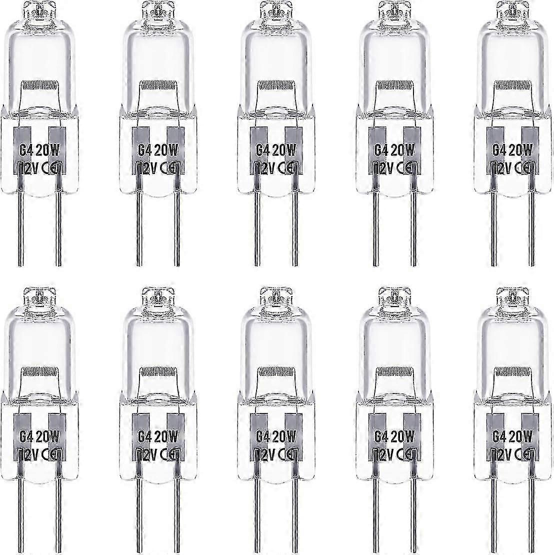 [High Quality]360 degree light angle, 20 watt halogen lamp. 12 v, 350 lumen, warm white 3000 K, dimmable, provide a comfortable and bright atmosphere. [Protect the eyes]According to the bionic natural light luminous design, high brightness, flicker-free, even light protects the eyes. [Environmentally friendly] No lead, mercury or any other harmful element to the environment. High energy efficiency with high brightness. Long life: up to 3000 hours. [Standard Size] diameter: 0.31 inch (0.8 cm), length: 1.16 inch (2.96 cm), base: G4 double needles. Please check carefully before purchasing whether the size is suitable for your lamp. [Widely Used]Perfect for crystal chandeliers. Also widely used in counters, cabinets, home or office desk lamps, garden or landscaping lighting, cabinets, etc. Advantages High quality 2000 hour lifespan, instantly on without any delay. No buzzing or buzzing. Security No flickering. No UV or IR radiation. CRI> 99. Better protect your eyes. Features Quantity: 20 Base: G4 pin base Diameter: 8mm Length: 29.6mm Bright: 350 LM Power: 20W Color temperature: 2800K warm white Certification: CE, RoHS Suitable size Ideal for chandeliers, G4 fixtures, G4 wall sconces and most G4 fixtures using 12V AC and DC fixtures Easy Setup Standard G4 halogen lamps, instantly without delay Pretty bright High quality eco halogen. 360 omnidirectional beam angle. 2800K warm white, mercury free.