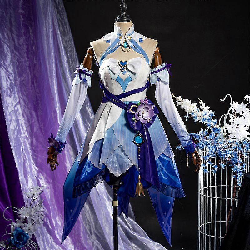 Step into the world of Teyvat as Nilou, the enchanting dancer from Genshin Impact. This high-quality cosplay costume brings Nilous flowing silhouette and ethereal style to life with luxurious fabrics, delicate details, and complete accessories. Perfect for fans who seek both accuracy and elegance, whether youre attending anime conventions, stage performances, or photoshoots. This set includes all essential components to recreate Nilous stunning look from her layered ombr dress to the butterfly wing back design, capturing the essence of her Hydro grace. Whats Included Dress with scalloped hem and translucent gradient panels Sleeves & sleeve accessories Headband, forehead jewel, and veil Butterfly-style back wings Transparent shoulder straps Waist sash with lotus flower accessory Neckpiece, vision emblem, back charm Waist chain, leg bands, hand & foot jewelry Earrings, hair accessories, back chainMaterials Main Dress: Brocade jacquard (non-stretch), shimmer chiffon, glitter organza, floral crepe Veil: Glitter snow gauze (non-stretch) Sleeves & Leg Covers: Elastic milk silk Wings: Transparent film fabric with glossy lining Headband & Accessories: Satin, PU glitter leather, high-end trimAvailable Sizes XS / S / M / L / XL / XXL Custom sizing available upon request. Best For Anime conventions, cosplay shows, Genshin Impact events, themed parties, Halloween, TikTok & YouTube content, stage performances, and collectors.